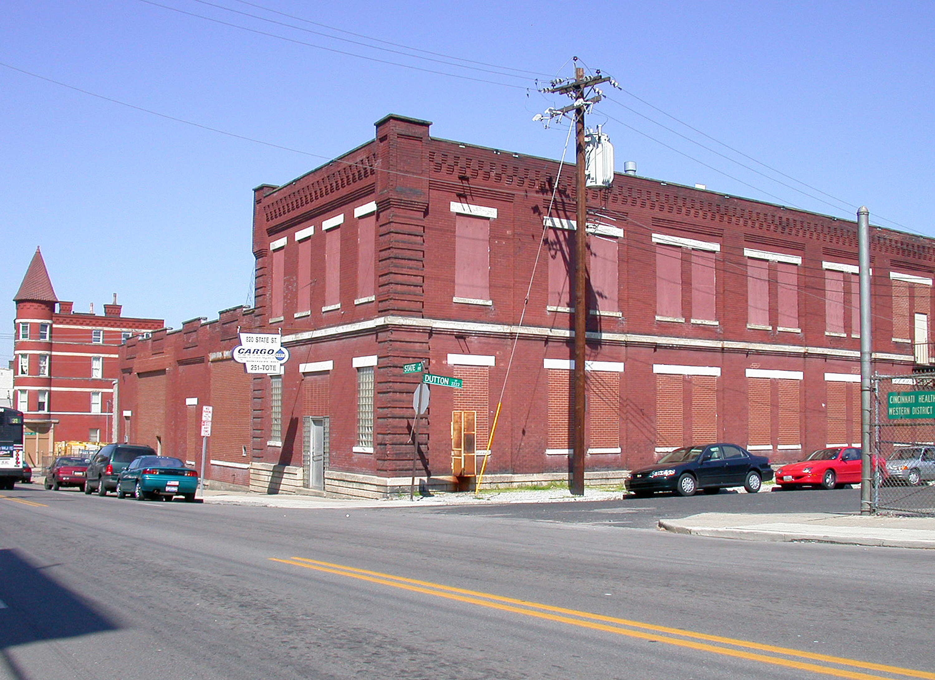 State Avenue shops, looking northeast at the corner of State Avenue and Dutton Street in Lower Price Hill.