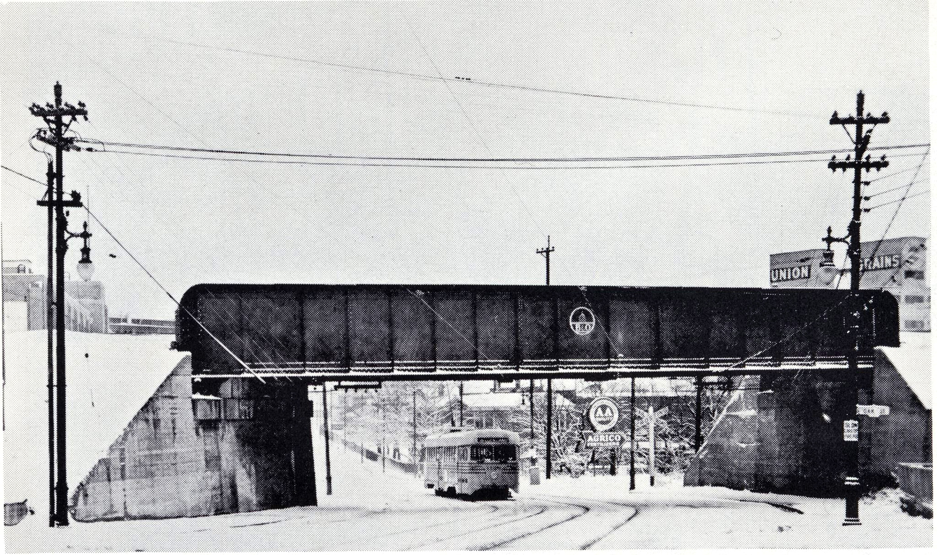Historic photo of a streetcar and old decorative trolley poles on Vine Street in St. Bernard, looking north at the B&O Midland overpass sometime in the 1940s.