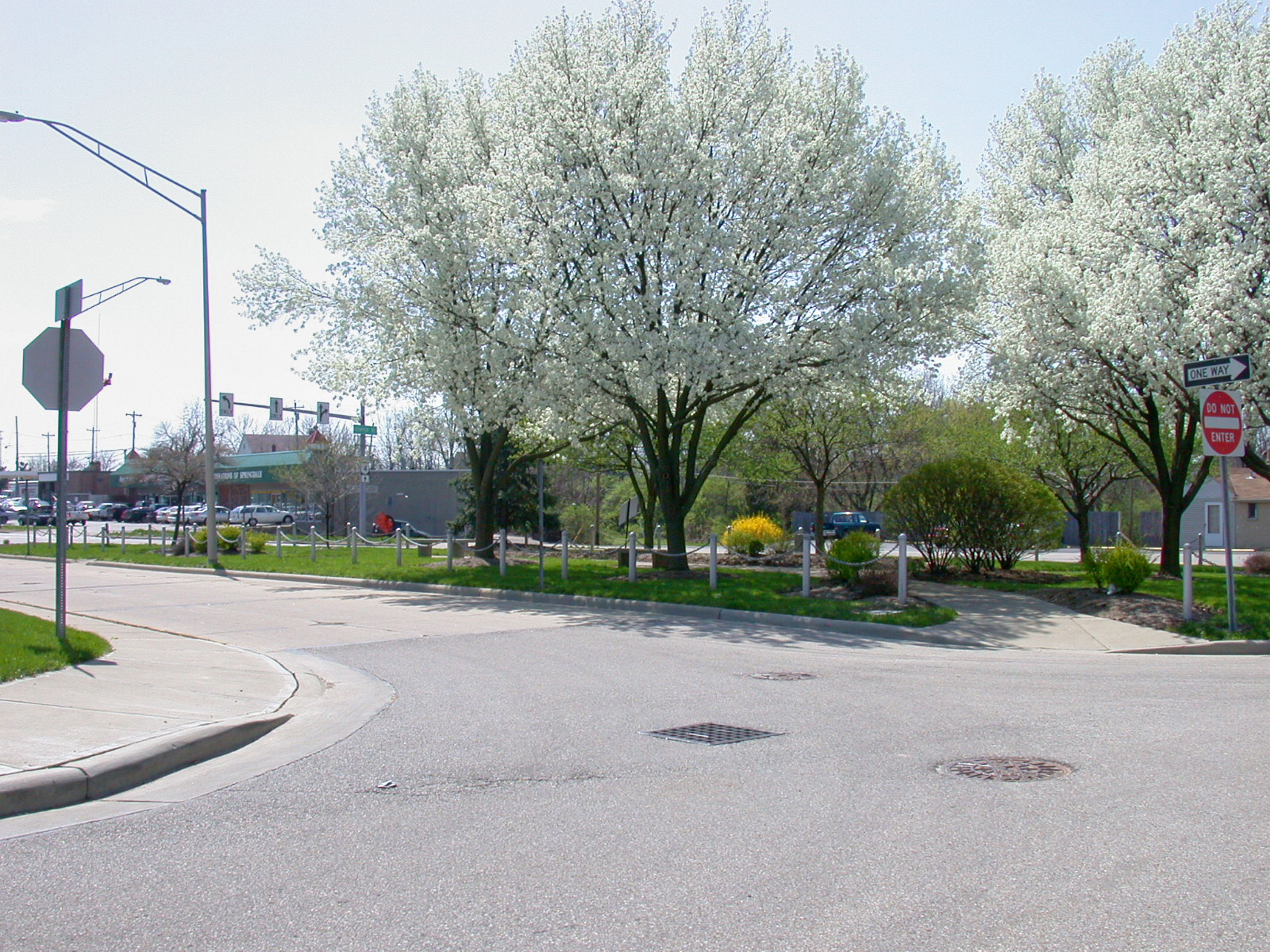 Location of the Cincinnati & Hamilton Springdale loop, immediately south of the city hall, looking southwest towards Route 4. After interurban service on the Cincinnati & Hamilton was abandoned, the people of Springdale funded the construction of this loop so the Cincinnati Street Railway, which took over the line from Hartwell to Glendale, could run streetcars to here. The tracks came in from the left, turned left around the park, then turned left again onto Route 4 to head back towards Cincinnati. The Springdale extension was only used from 1928 to 1930.