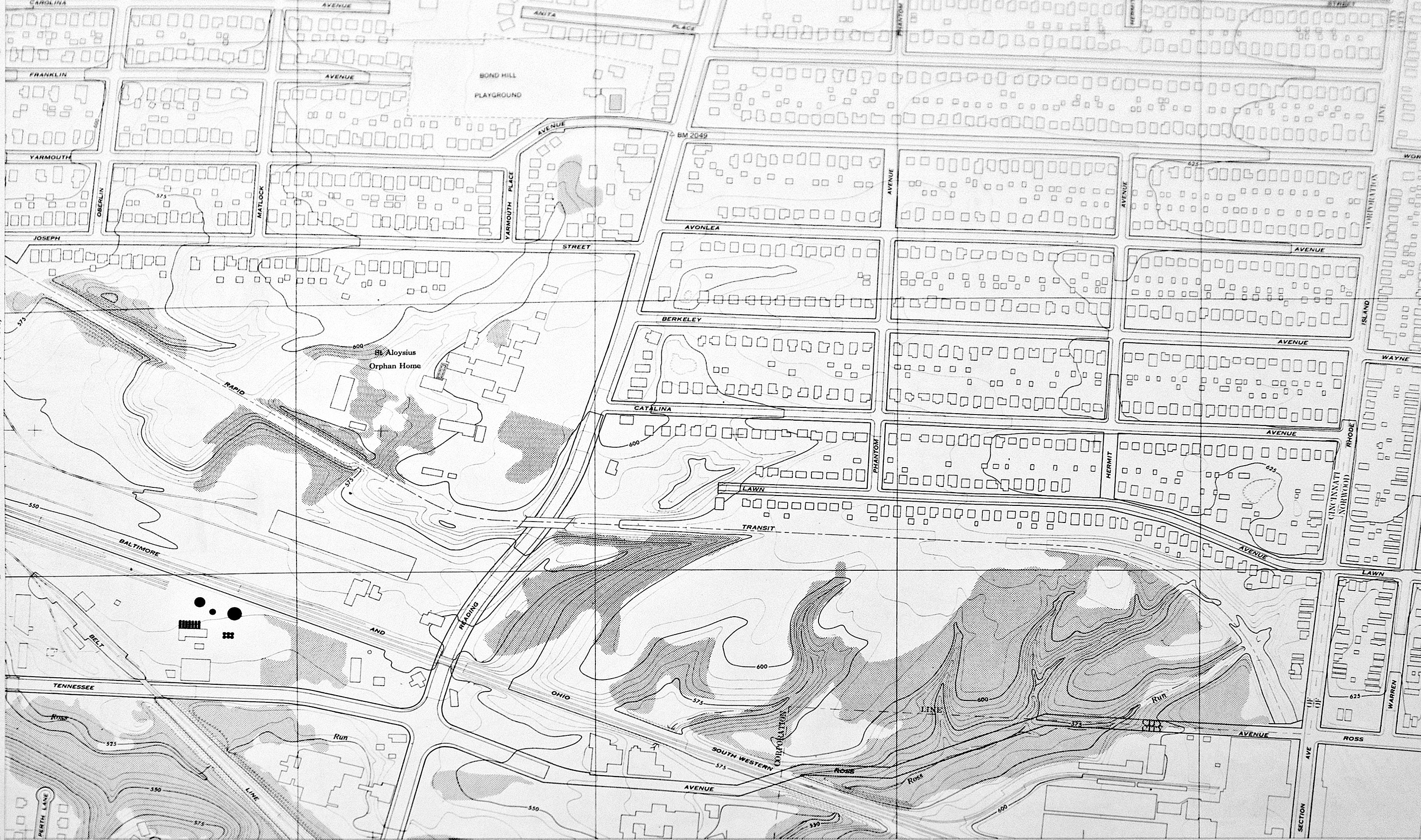 1948 USGS map showing the at-grade subway route in Bond Hill. Note the marked Rapid Transit route to the south and west of St. Aloysius. The Norwood Lateral follows that route and it crosses Reading Road at the location of the rapid transit bridge. However, the Lateral continues southeastward from there and crosses Ross Avenue at the B&O tracks. The rapid transit route east of Reading is now just a fence line along the north and east side of the Mercy Health (former Showcase Cinemas) parking lot. Note the entrance to the Section Avenue tunnel at the bottom right.