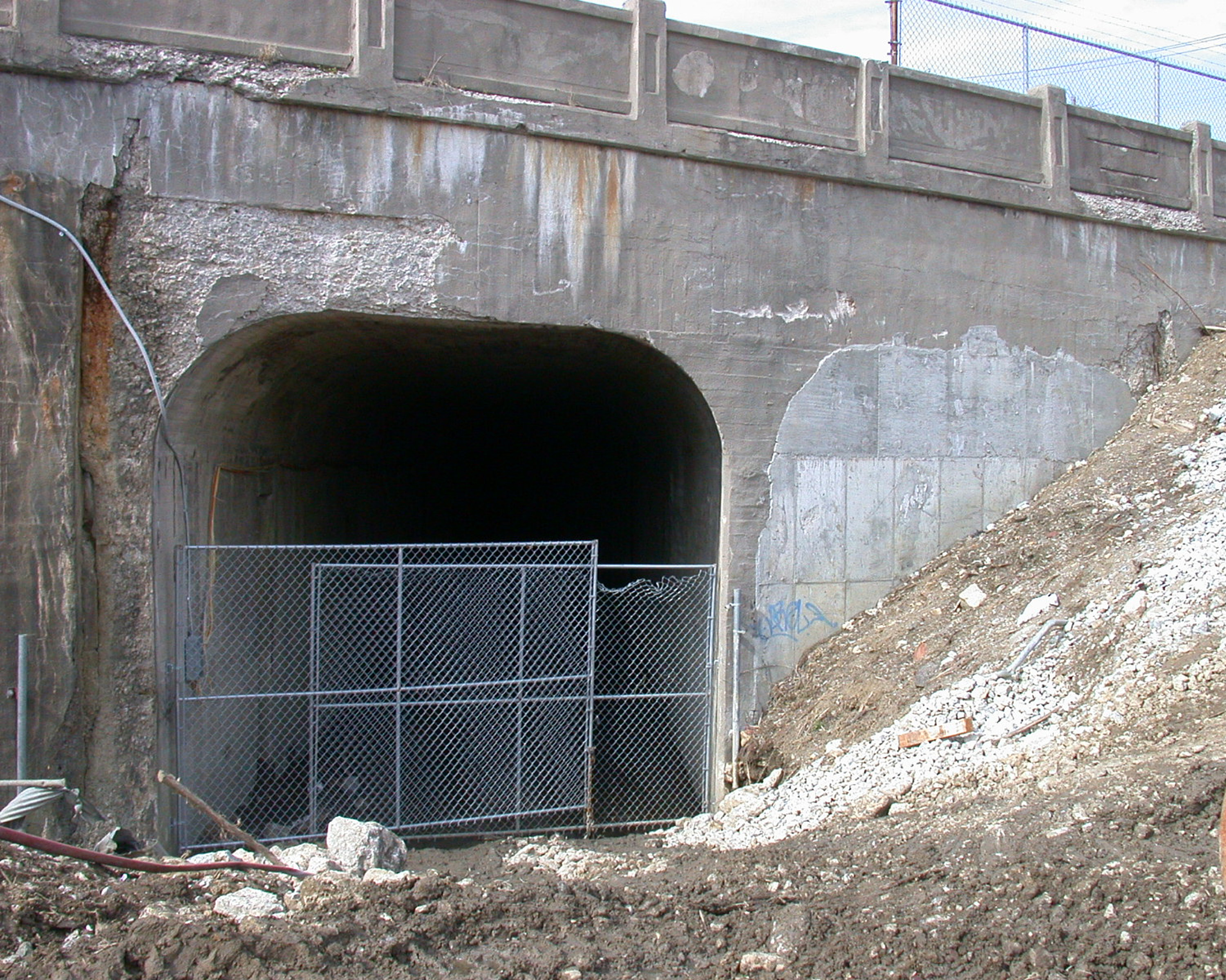 East portal of the Forest/Zumbiel tunnel for the subway in Norwood, looking northwest from the baseball field at Waterworks Park. Again, the north tunnel has been sealed off with concrete, but the south tunnel is still open. Some temporary lighting can be seen on the left side of the tunnel, where sewer and/or water line work is going on. The tunnel curves gently to the left, so it's not possible to see to the other side.
