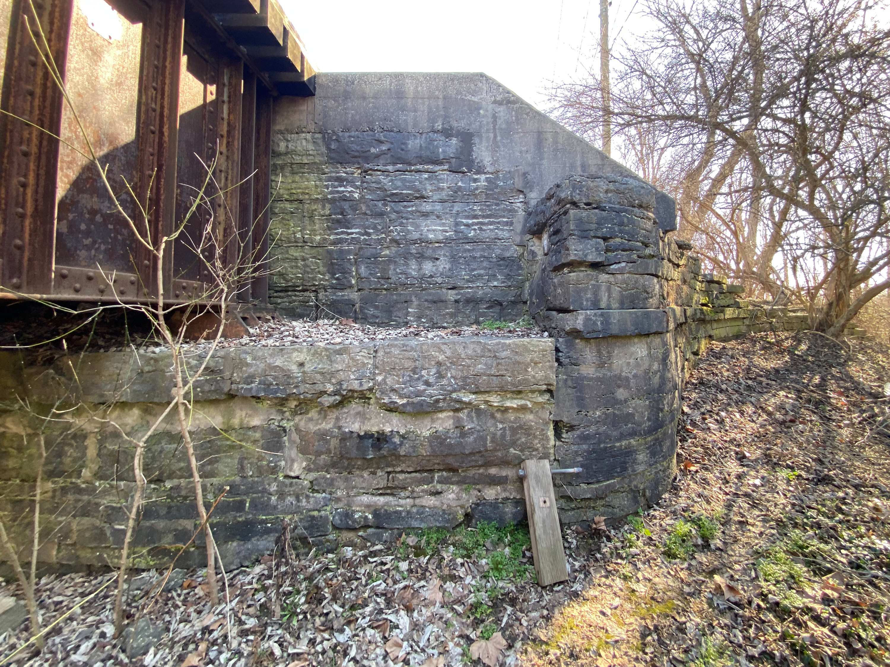 Detail view of the Dry Fork Creek bridge south abutment. This is the far right side of the previous photo. Note the curved edge of the wall and the curved stepped down retaining wall to the right. This detail matches the aqueduct abutment on the west side of the Great Miami River for the Big Four/I&O CIND bridge.