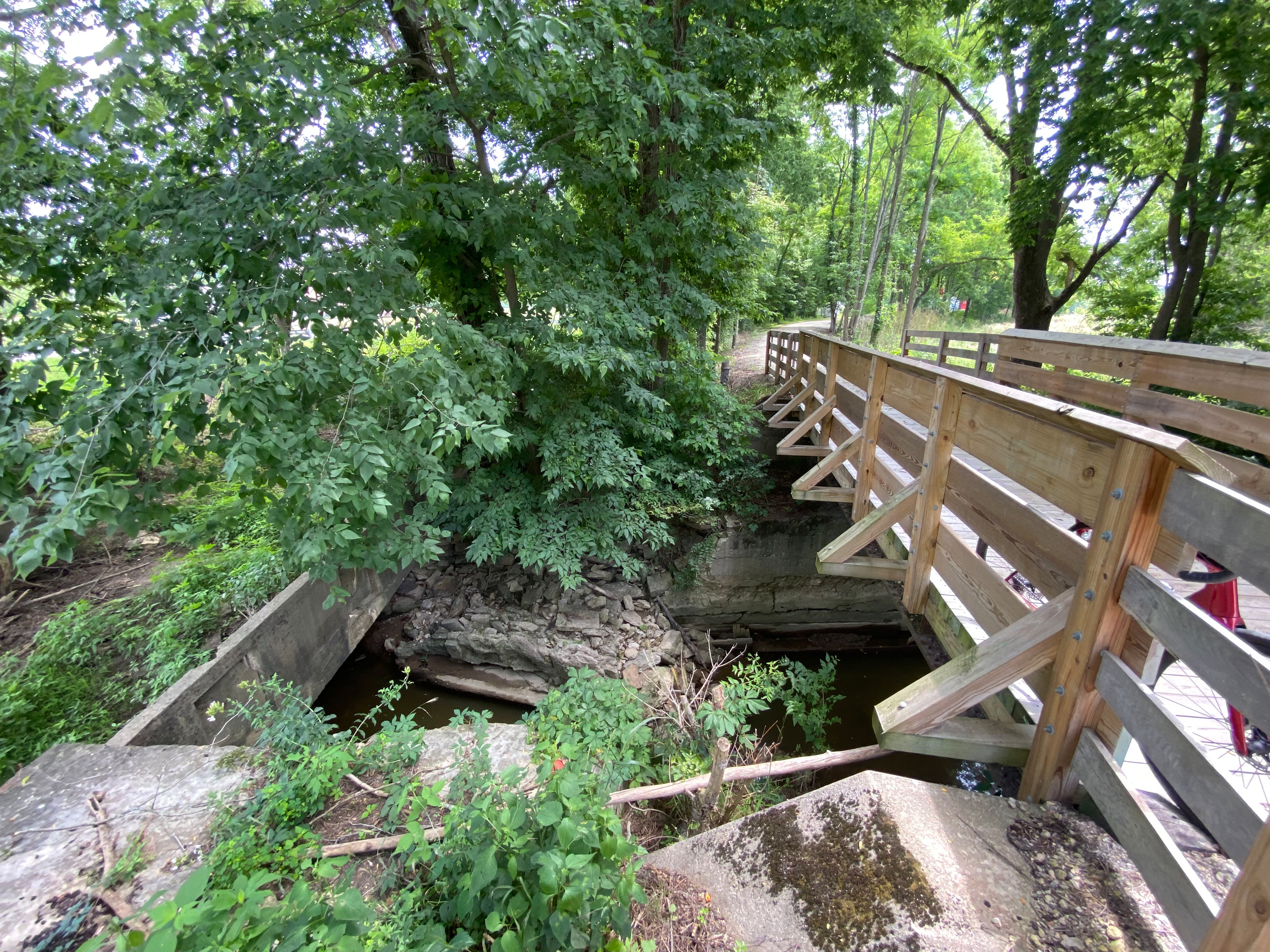 Whitewater Canal Goose Creek aqueduct, looking East along the towpath trail and railroad right-of-way.