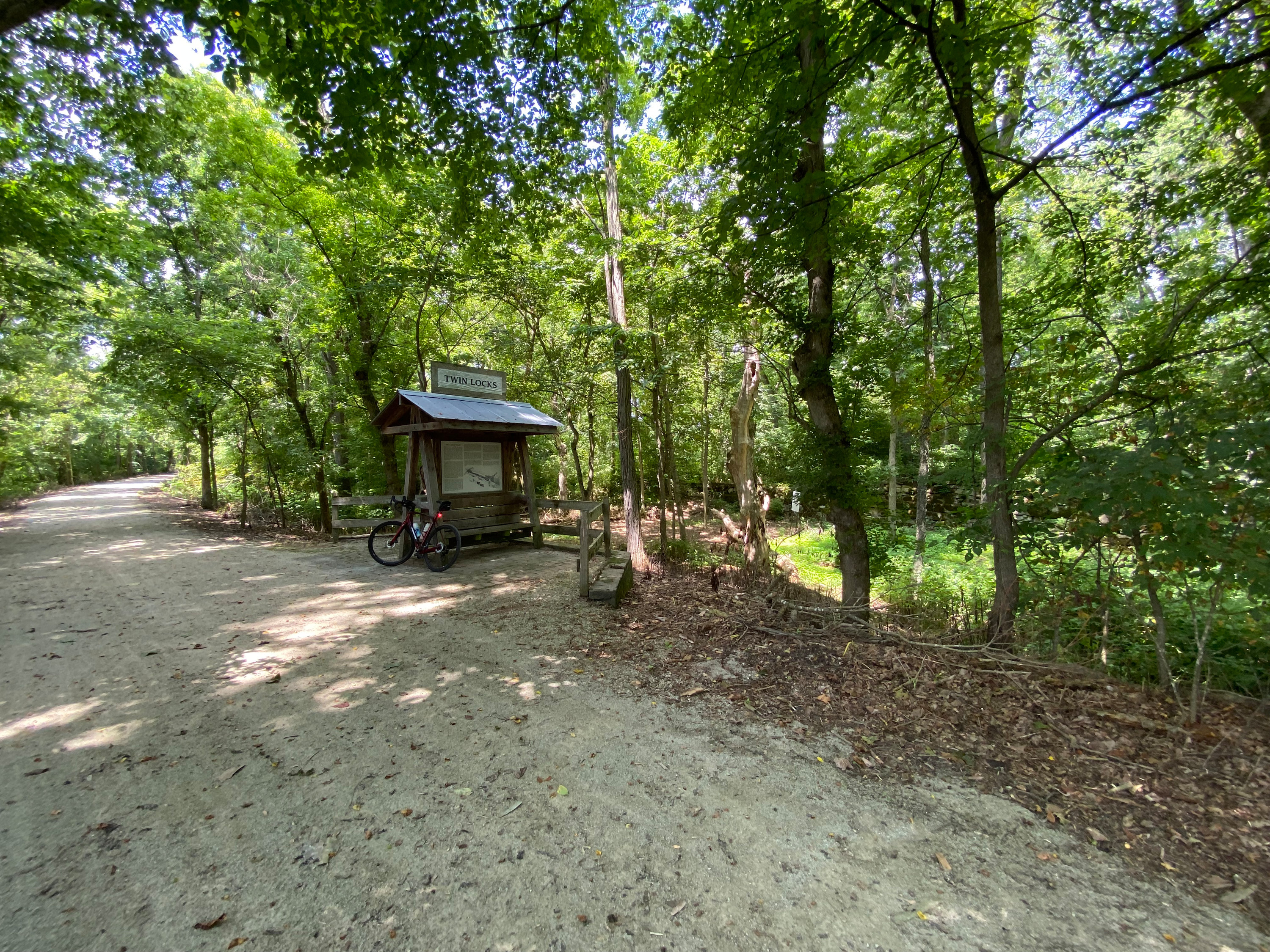Information kiosk at Whitewater Canal upper twin lock 23. The lock can be seen behind the trees to the right of the kiosk.