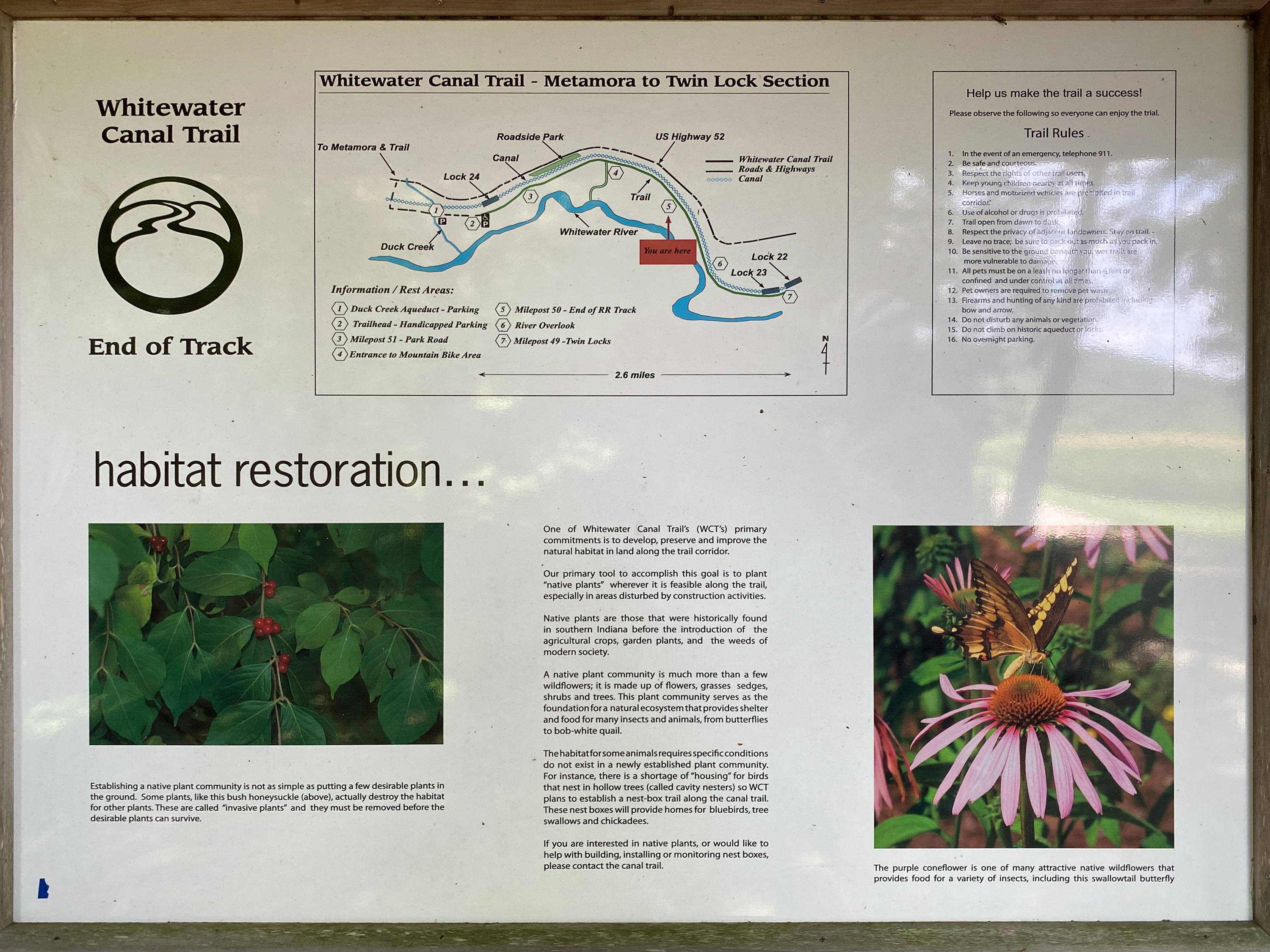 Whitewater Canal and railroad informational board near where the railroad tracks start.