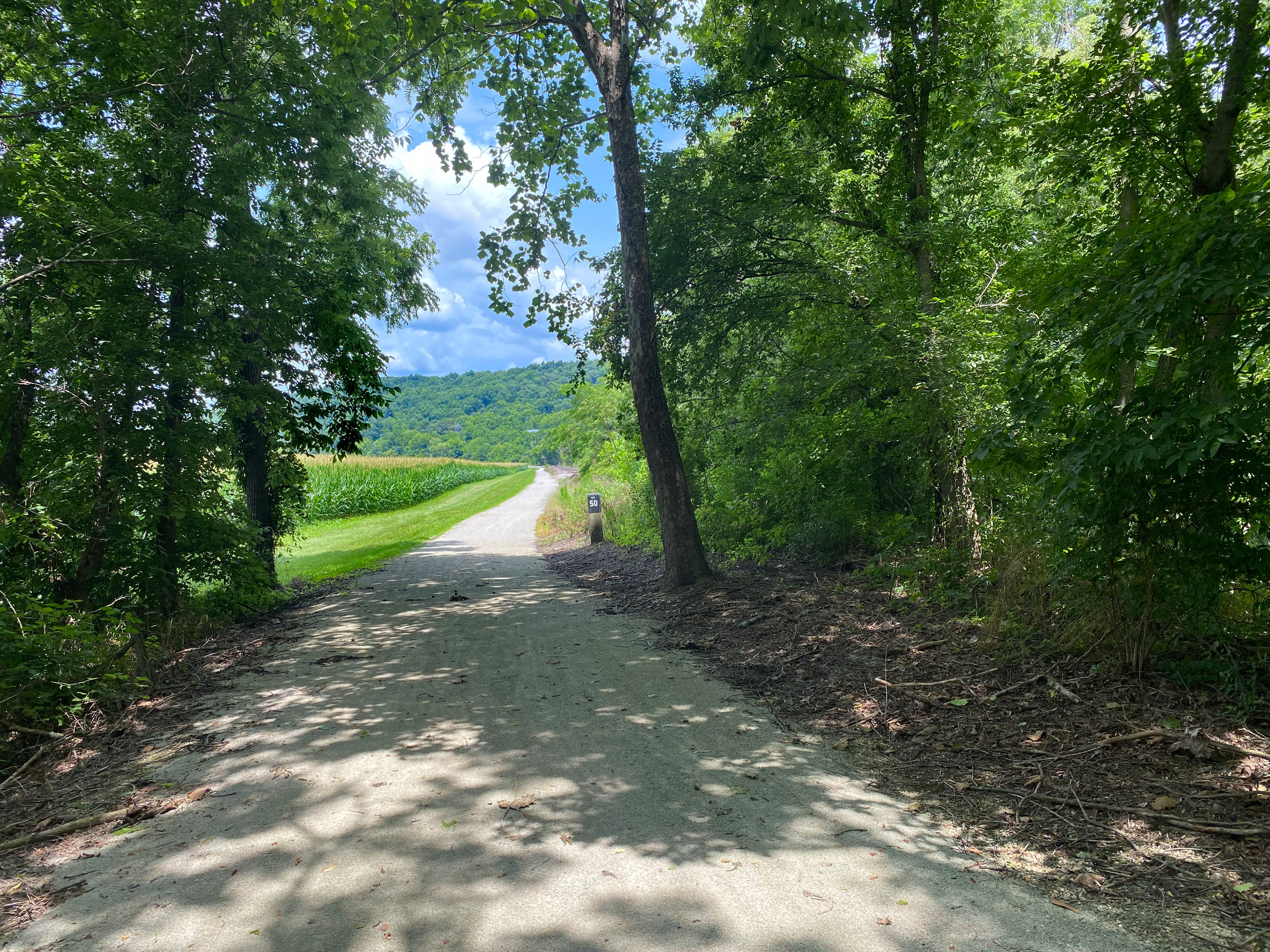 Whitewater Canal towpath trail dipping down off of the towpath where the railroad tracks start. The tracks can just barely be seen past the 50 mile marker ahead.