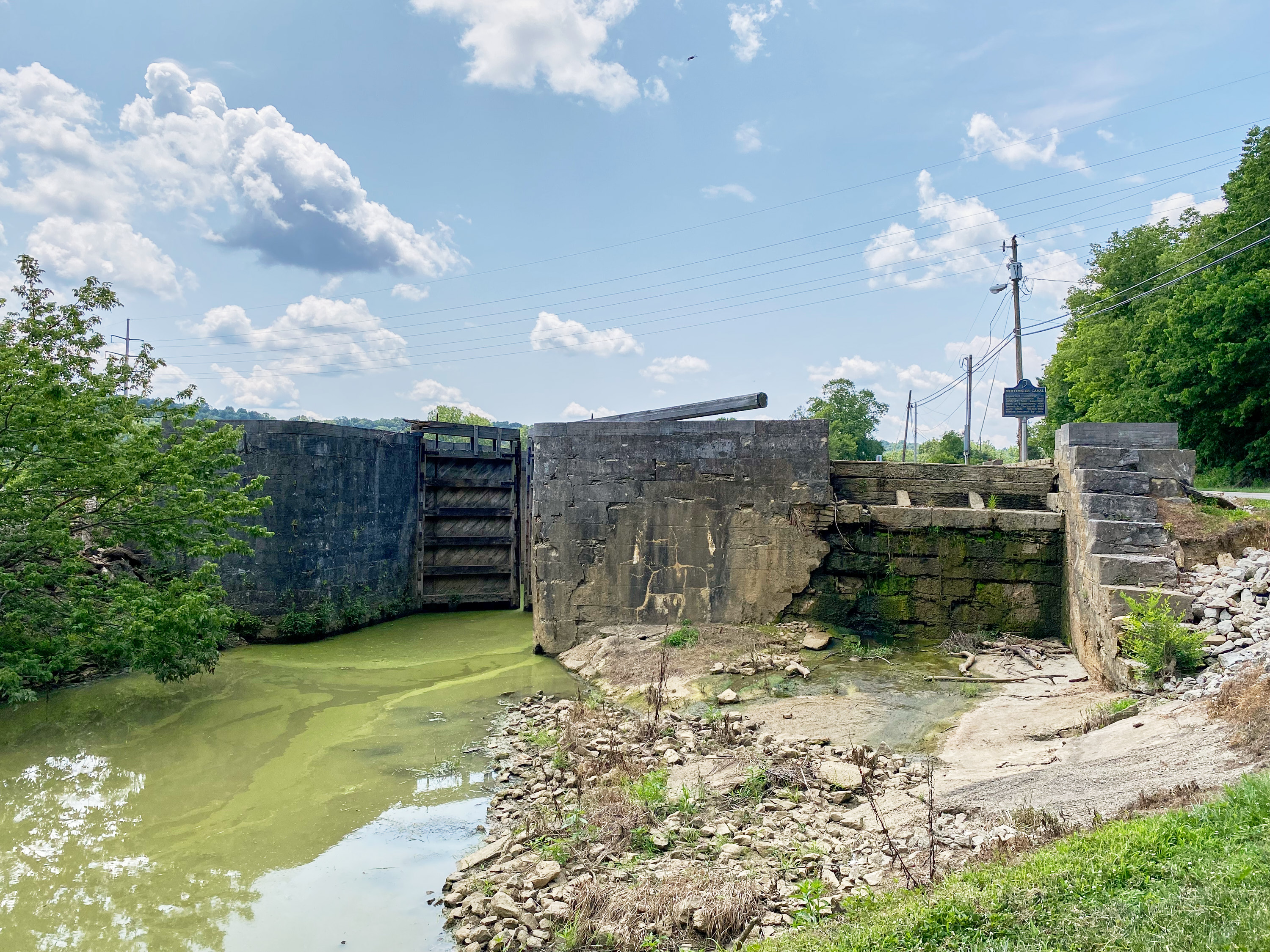 Whitewater Canal lock 24 east of Metamora along US-52. The restored lock gates are themselves falling apart, and due to silting over of the canal, there's not enough water to overflow the spillway at the right.