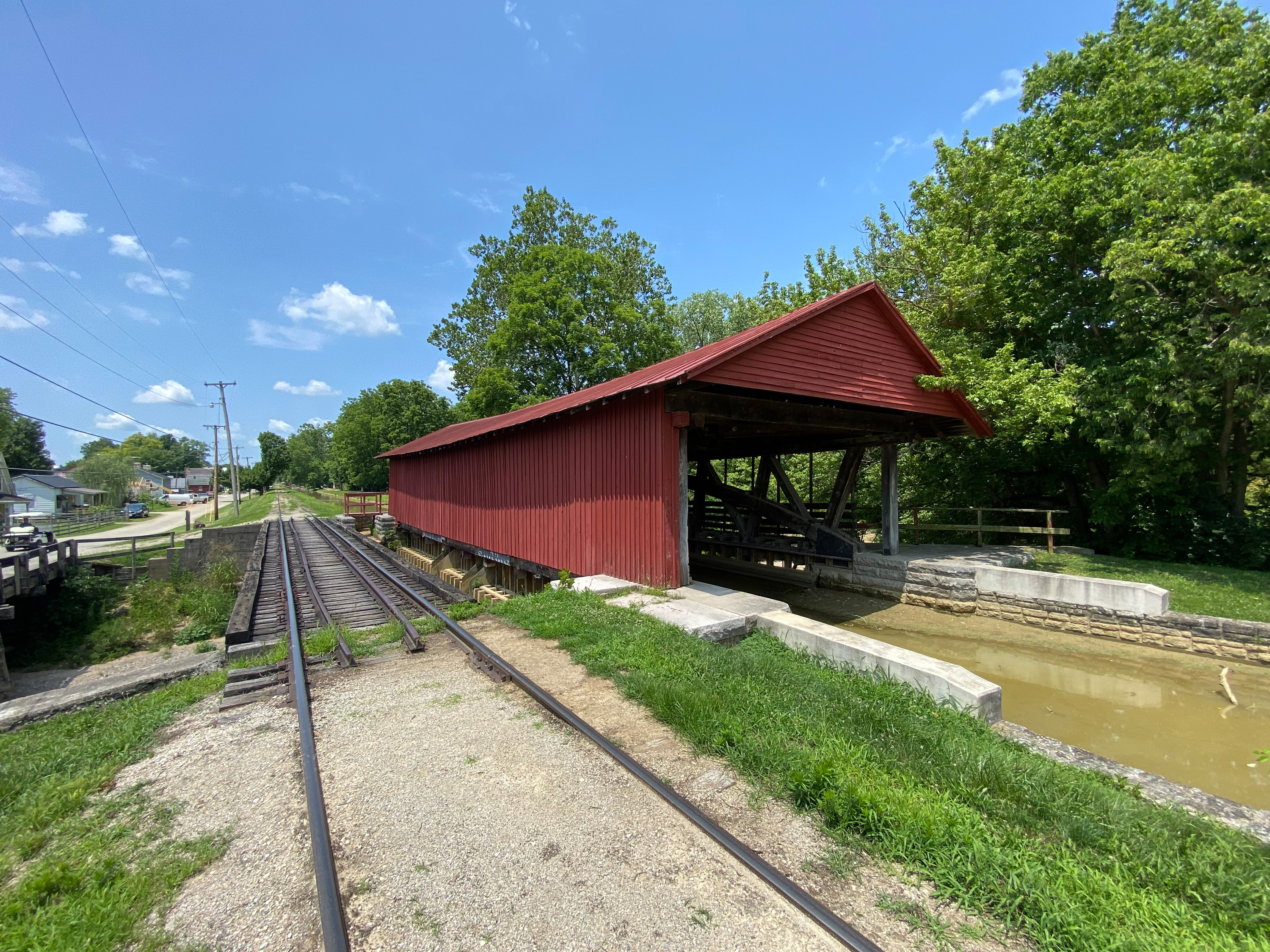 Whitewater Canal Duck Creek aqueduct in Metamora, looking west along Main Street. This is the only covered wooden aqueduct in the United States. The first aqueduct was built at this site in 1843 but it was destroyed by a flood in 1848. It was strengthened in 1868 after the canal was shifted to hydraulic use, and in 1901 it was repaired and raised to a slightly higher elevation. In 1939 the floor of the trough collapsed and the structure sat derelict. It was restored between 1946 and 1949 and has received routine maintenance since the 1970s. Most recently in 2005 the trough was replaced.