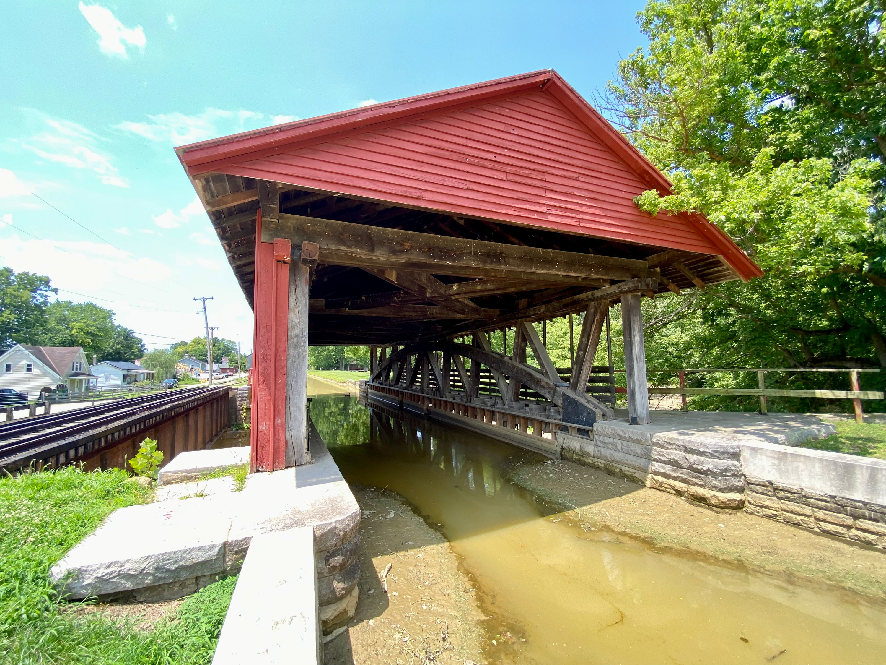 Inside the Whitewater Canal Duck Creek aqueduct. The Burr arches and most of the trusses are original to the 1840s, but much of the rest of the structure dates to the 1940s restoration.