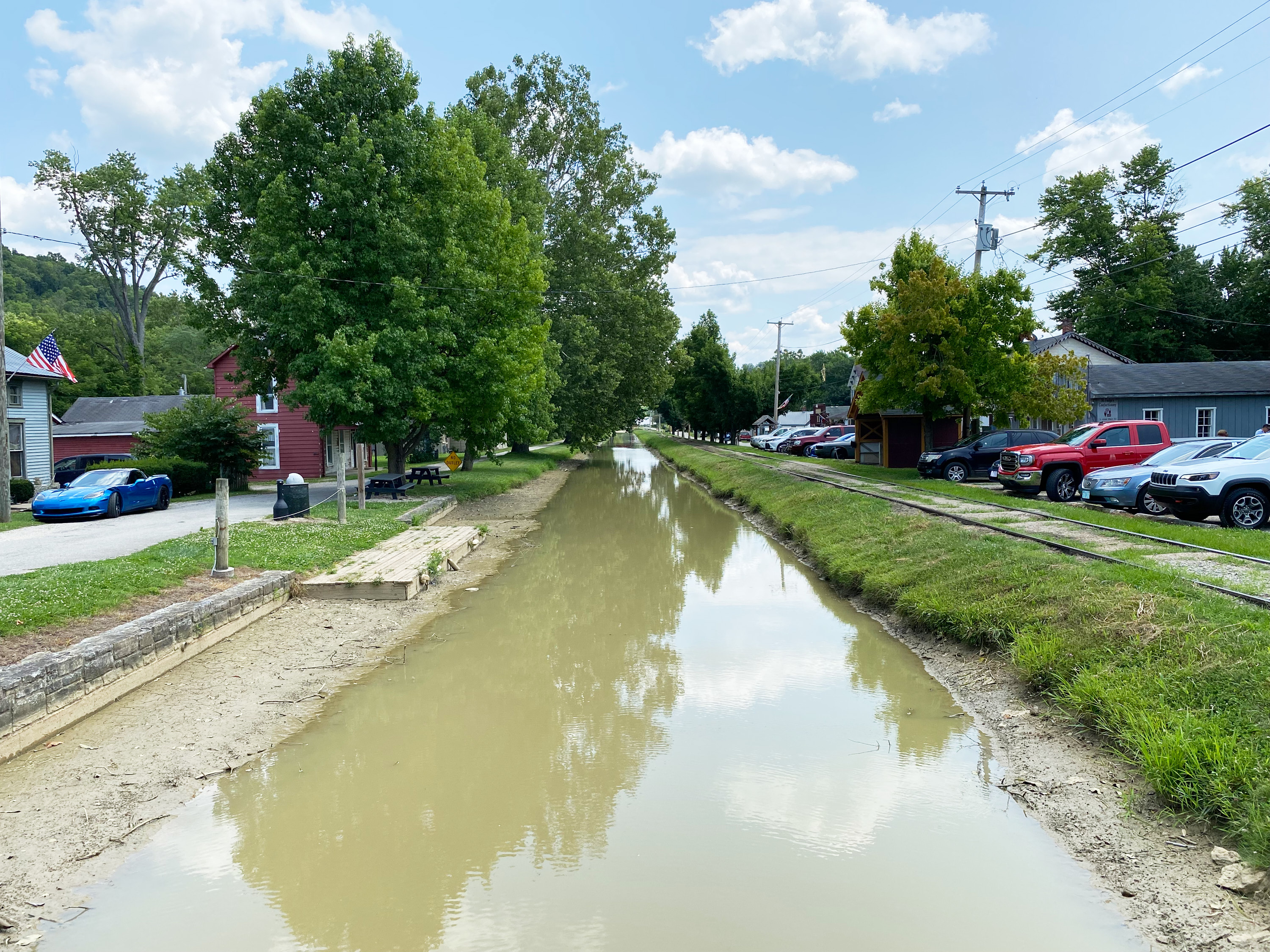Whitewater Canal and railroad in Metamora, looking east from Columbia Street
