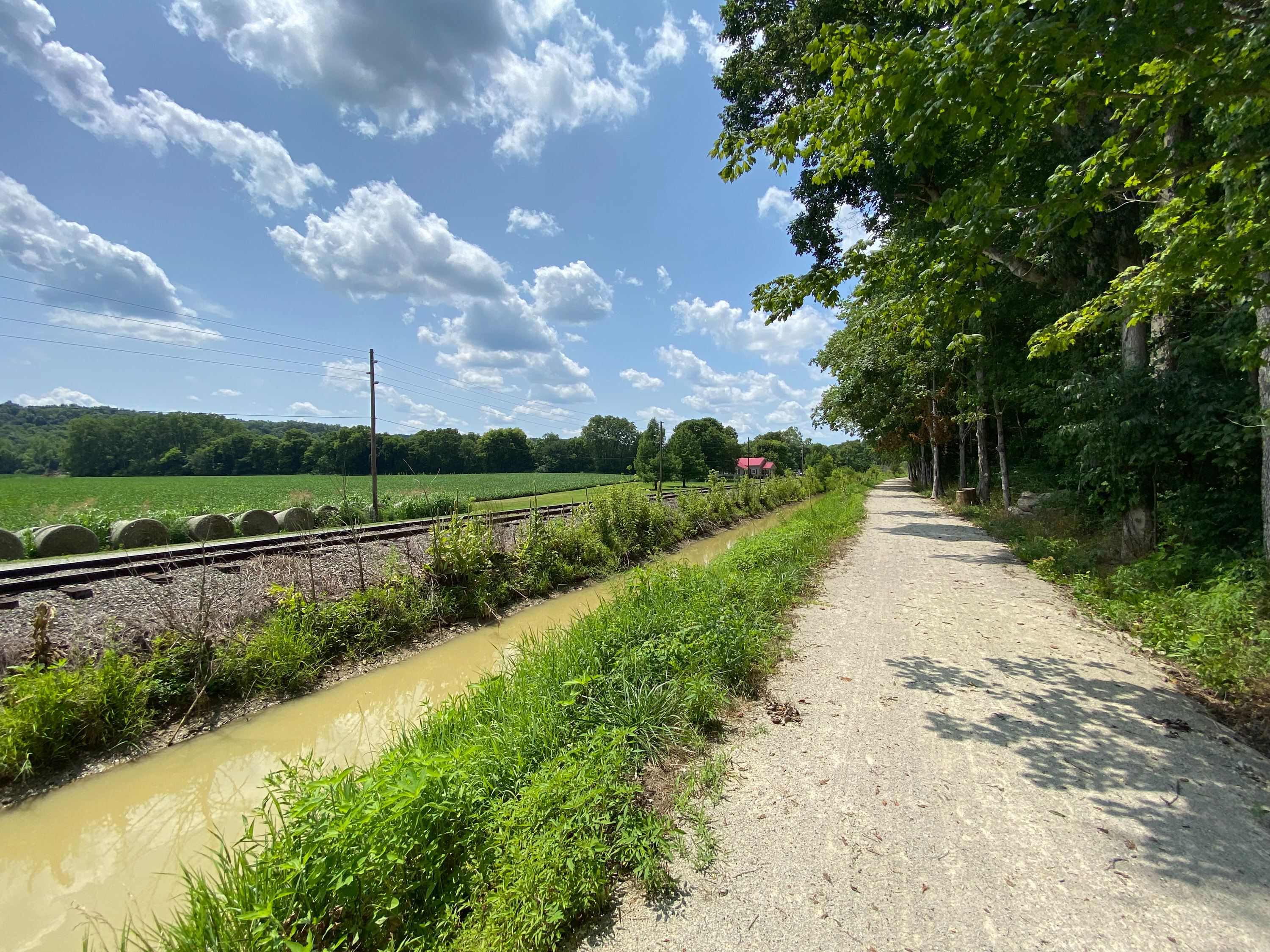 Whitewater Canal and railroad west of Metamora, looking west. The canal is significantly narrowed to provide room for the recreational trail for much of the rest of its length to the Laurel feeder dam.