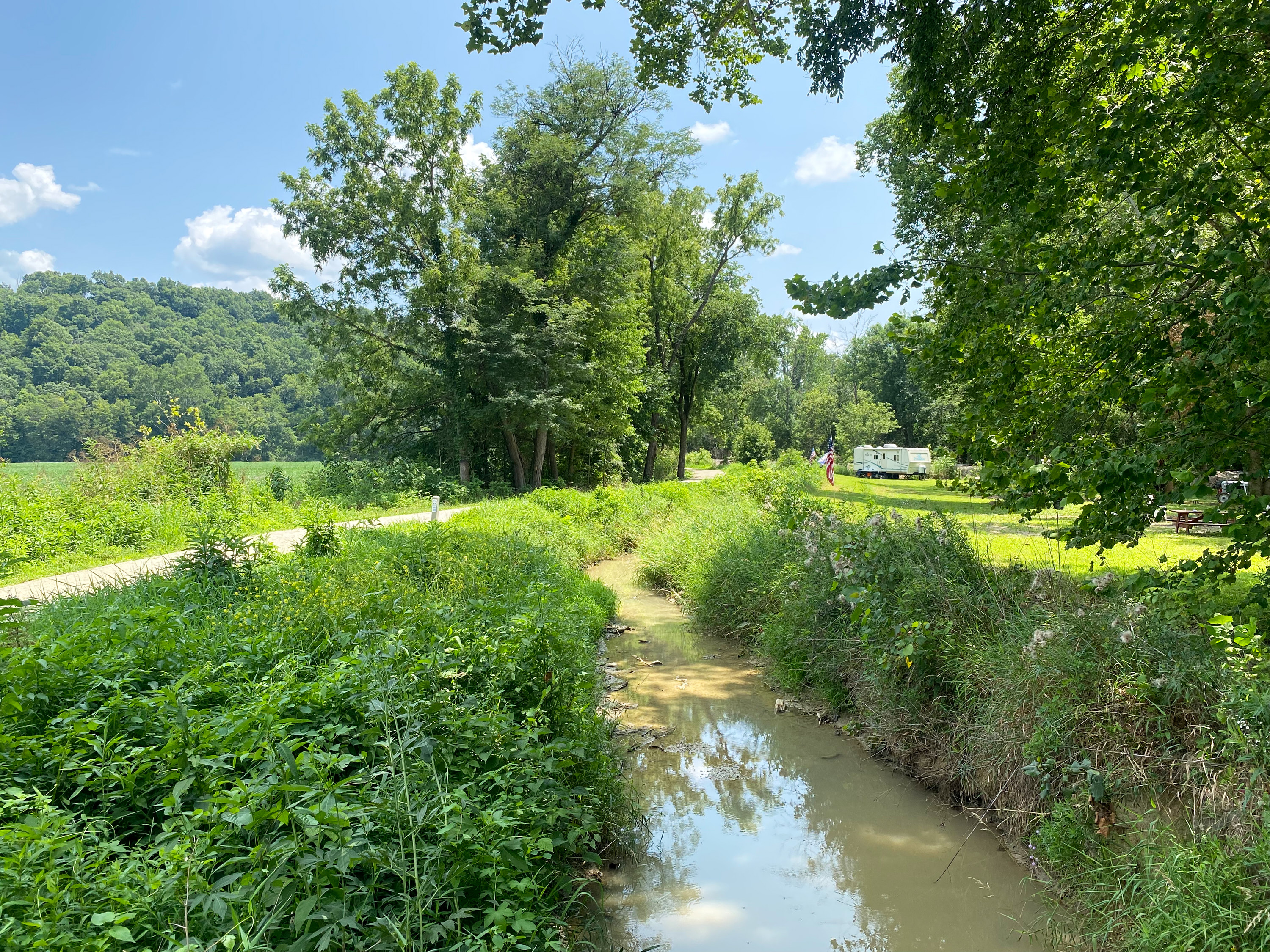 Whitewater Canal near the Laurel Conservation Club. The railroad took a shorter route though here, bypassing a long sharp curve on the canal. This is looking back towards Metamora, and the recreational trail is on the heelpath.