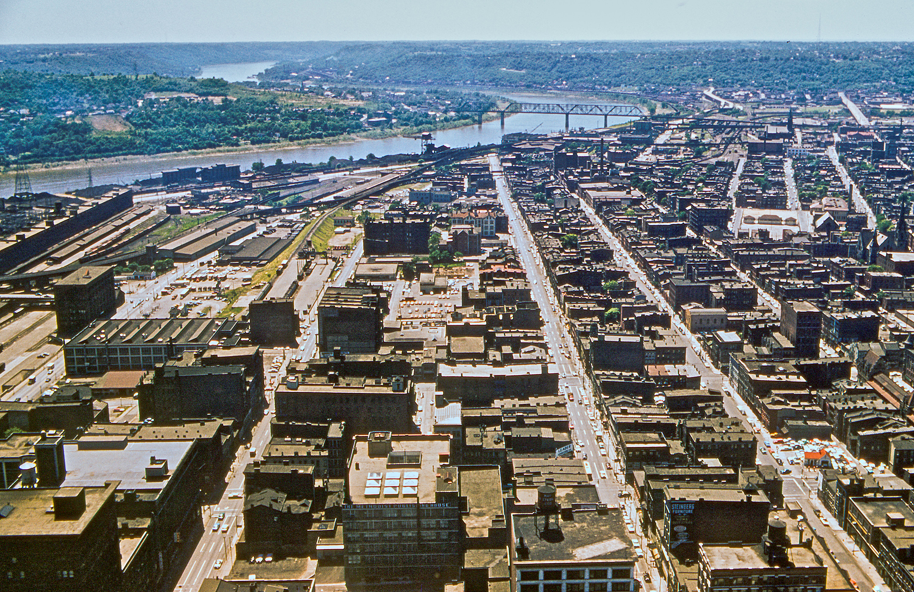Historic photo of Queensgate and northern Kentucky, looking west from Carew Tower. The B&O warehouse, now Longworth Hall, and the C&O viaduct are visible at left. The Cincinnati Southern Bridge is at the top, and the 8th Street Viaduct is at the far top right. The smokestack for the Hudepohl Brewing Company is visible just below the Cincinnati Southern Bridge. The single track on a grassy berm at the left center feeds into a small intermodal yard for the C&O on 4th Street (the UPS processing facility that remains to this day is directly to the left of there). Today it's an office building site, but the remnants of the connection to the main C&O viaduct still remains at 3rd and Gest Streets. Very few of the rest of these buildings remain today, as they were cleared out for industrial development and highway ramps. The huge tangle of ramps for I-75 and US-50 today occupies the entire bottom half of this photo. Original photo 1958 by Nelson Ronsheim. Scanned by Michael G. Smith 2009.