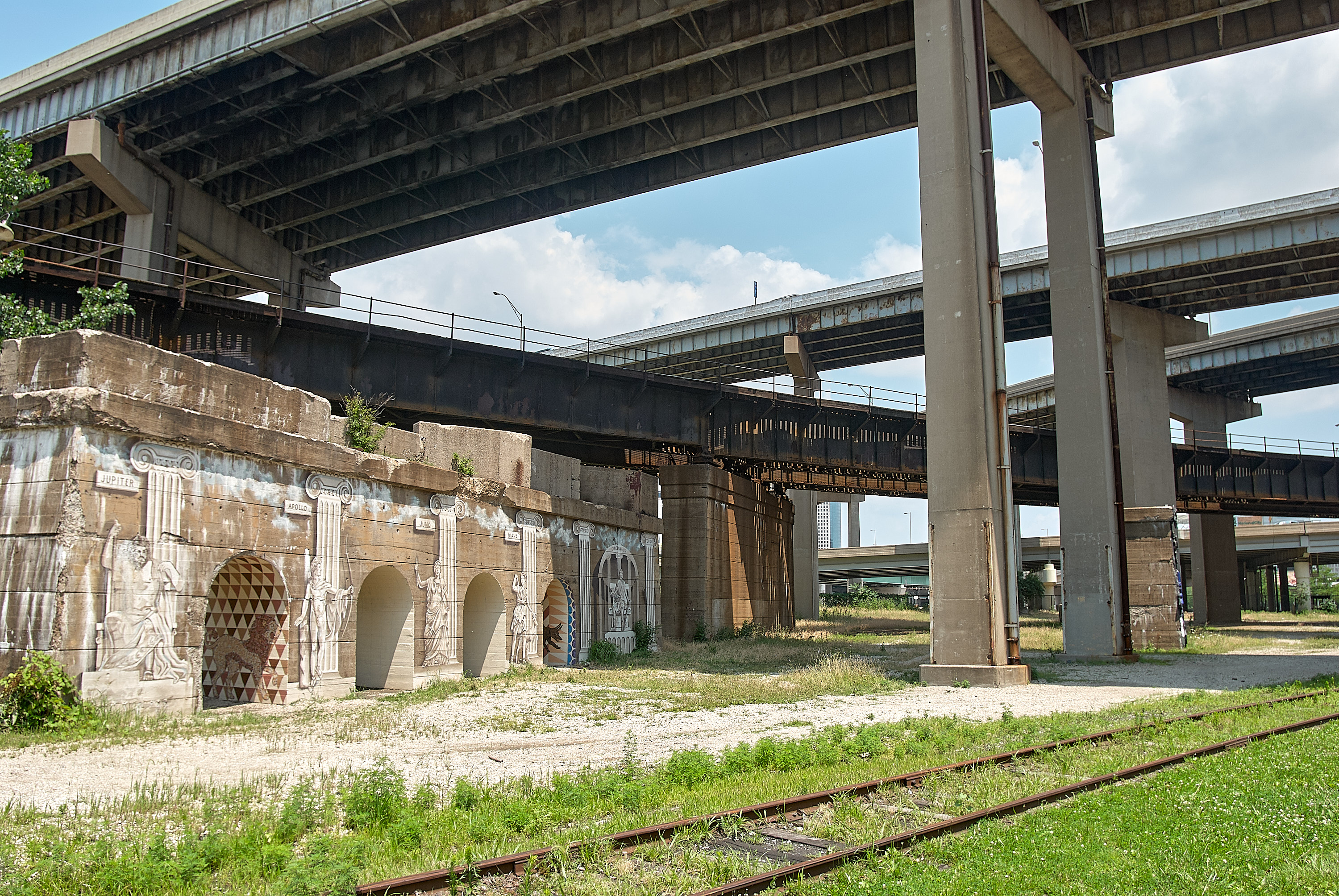 The C&O viaduct and Big Four tracks at the approach to Central Union Depot, looking northeast from the parking lot at Longworth Hall. The abandoned pier at left dates from the original 1889 bridge approach, which was partially reused for the aforementioned viaduct that decended to grade a few hundred yards west of here. I-75 is overhead.