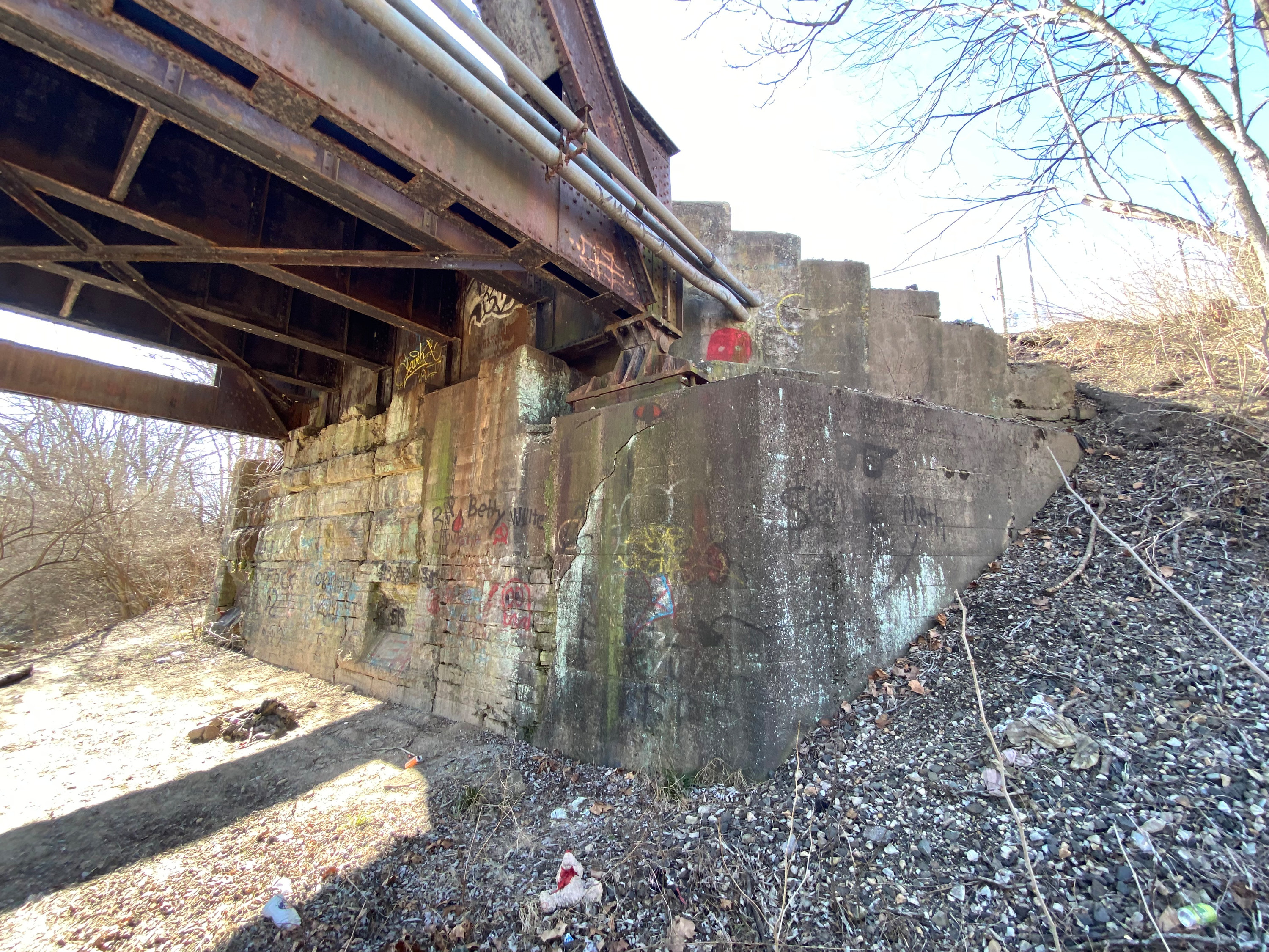 Close-up of the Cincinnati & Whitewater Canal aqueduct abutment on the west side of the I&O CIND, former Big Four, Great Miami River bridge in Cleves.