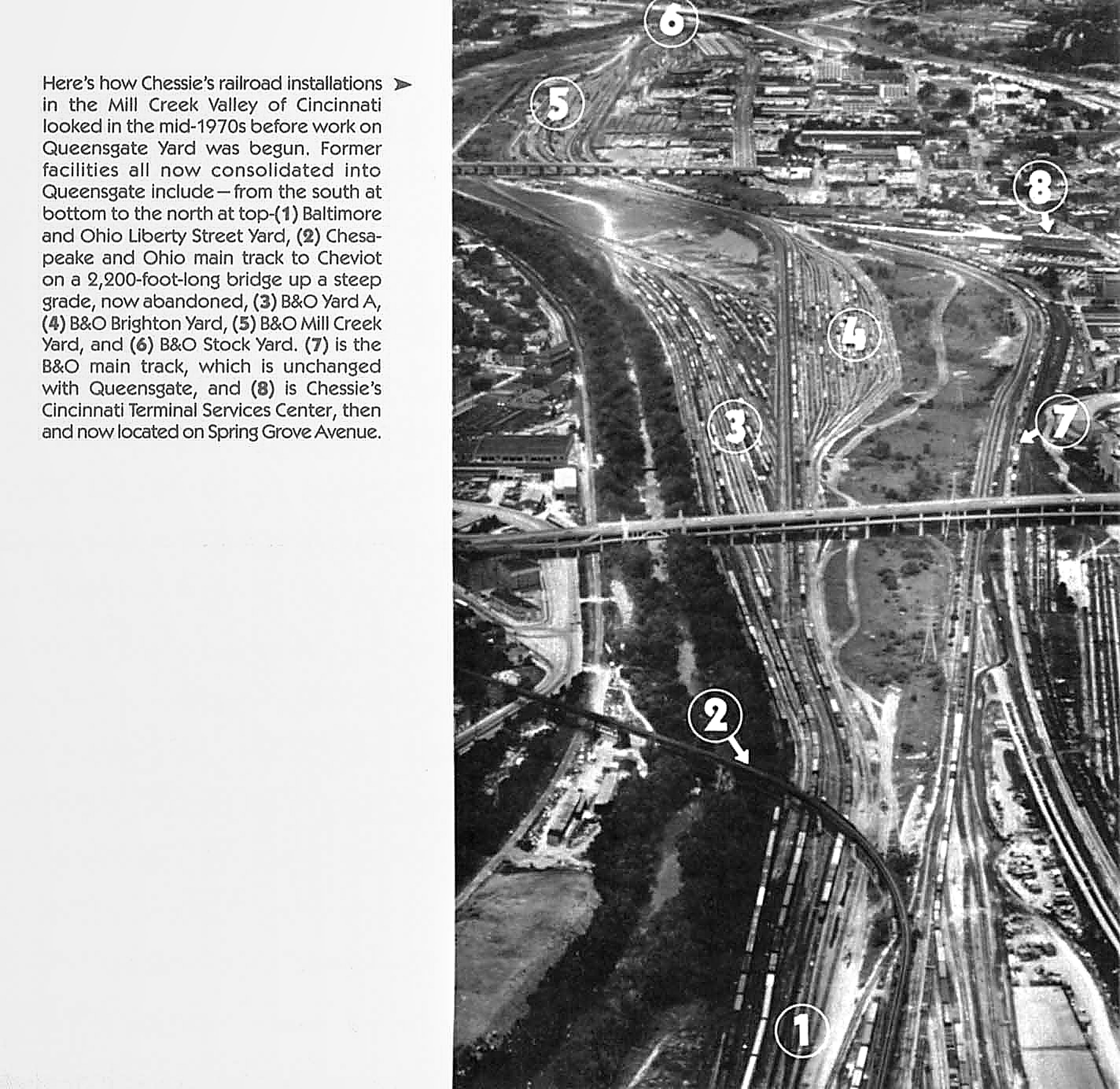 Historic aerial of the Mill Creek Valley, looking north over the Western Hills Viaduct. Number 2 points to the old trestle for the C&O of Indiana, starting its climb up the hills to the west of the valley.