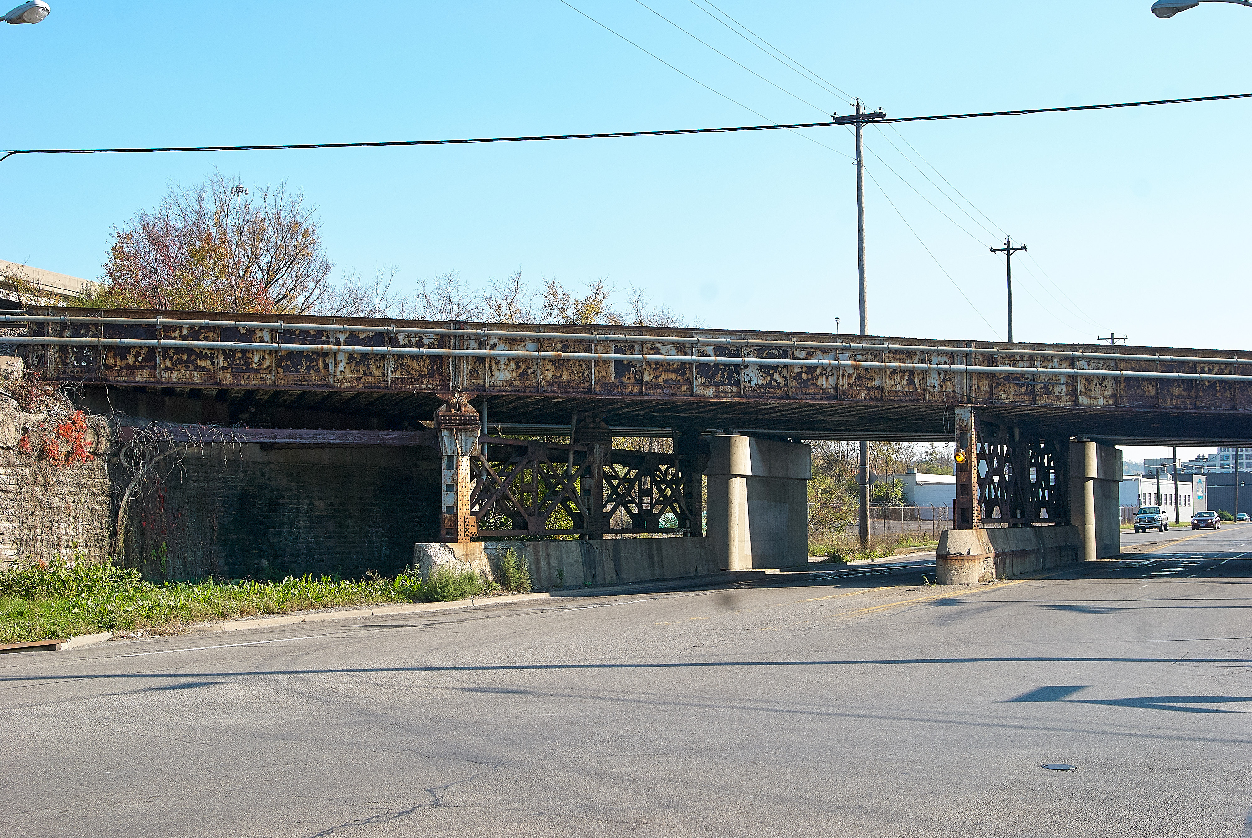 B&O mainline crossing Spring Grove Avenue in South Cumminsville, looking south. This is just north of the massive Queensgate Yards. The original bridge is two tracks, but the newer third track can be seen with the concrete piers on the other side. Note the decorative metalwork at the far left that's overgrown with vines.