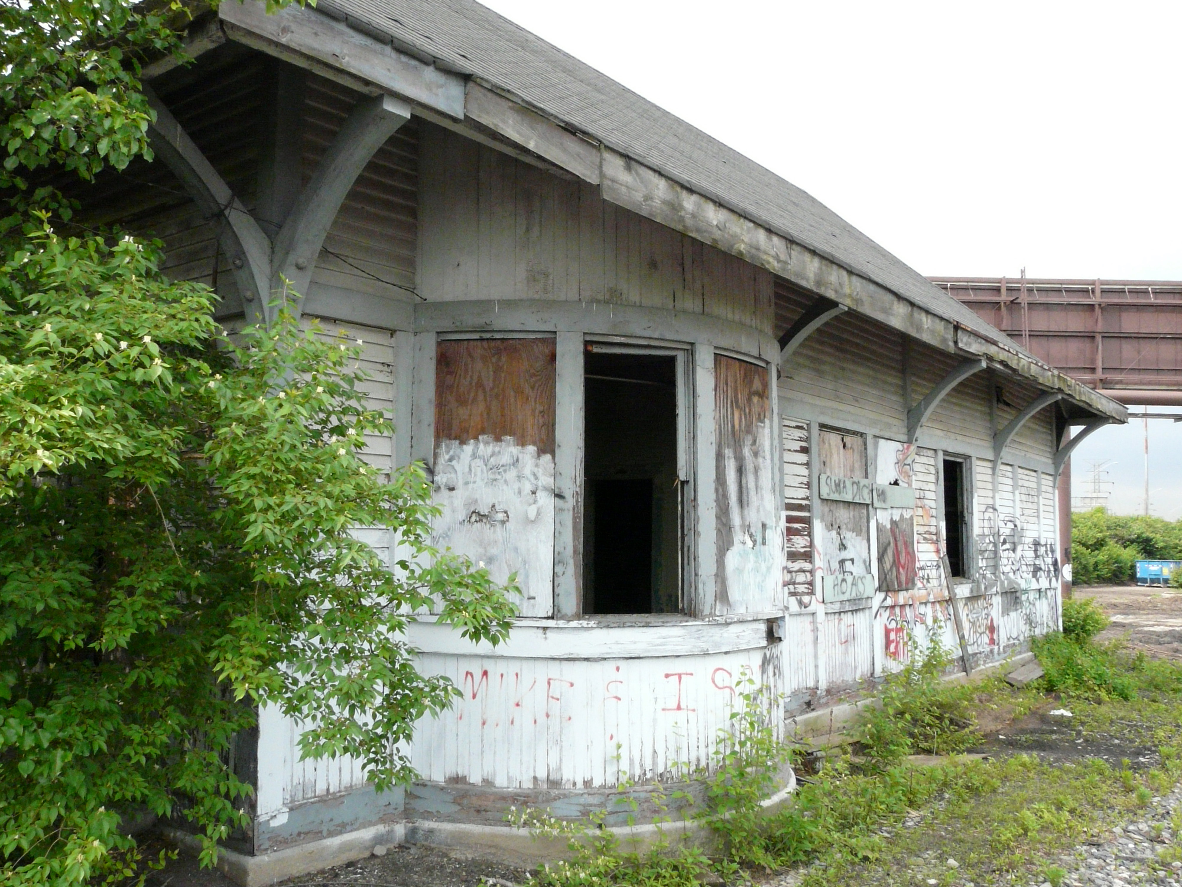 A more recent view of the old B&O St. Bernard station, looking southwest towards I-75. Like the Oakley station, there used to be a small tower/dormer over the round bay window, but it was removed at some point in the early 20th century. Photo by David Frey.