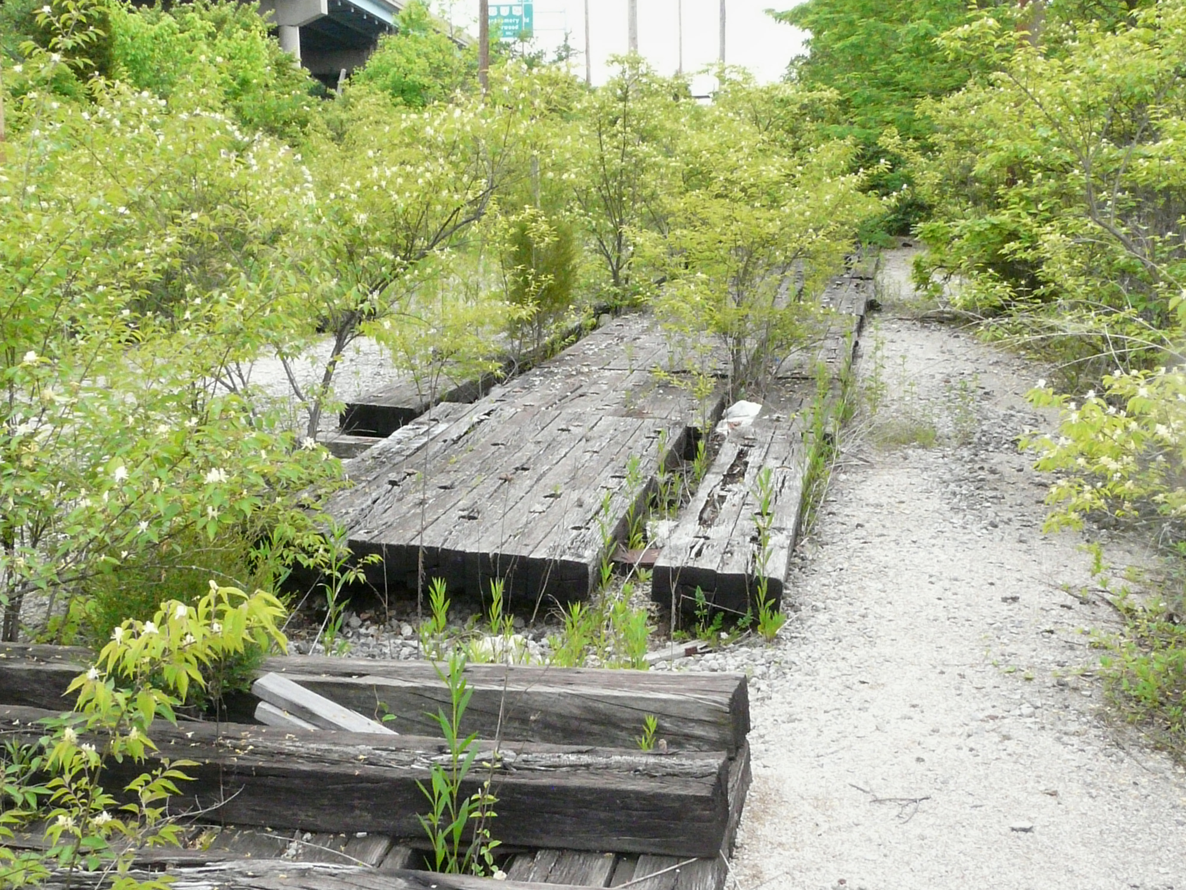 Track structure at the old GM loading platforms, looking east with the Norwood Lateral overpass at the top.