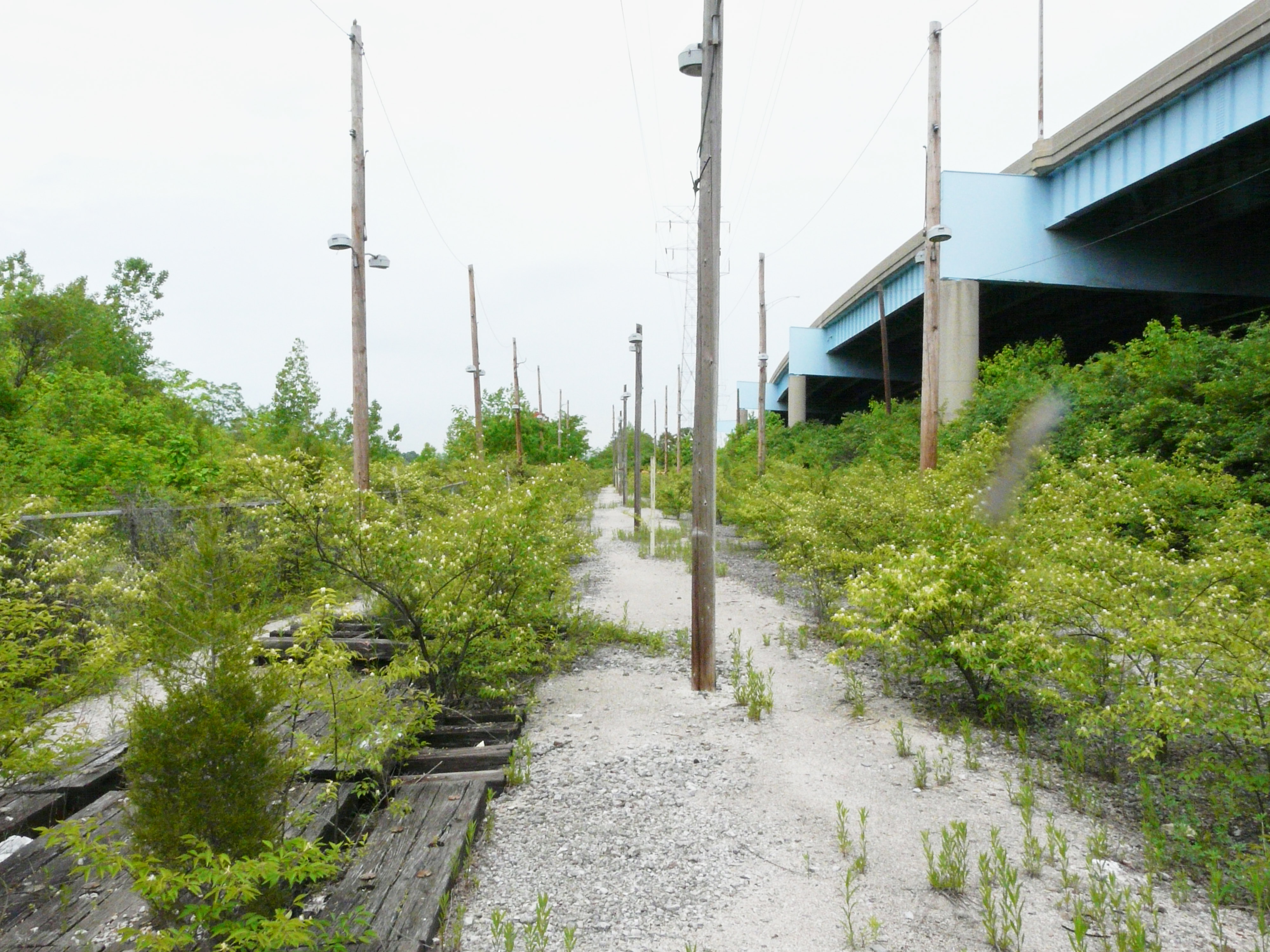Looking west along the old GM loading platforms with the Norwood Lateral overpass at the right.