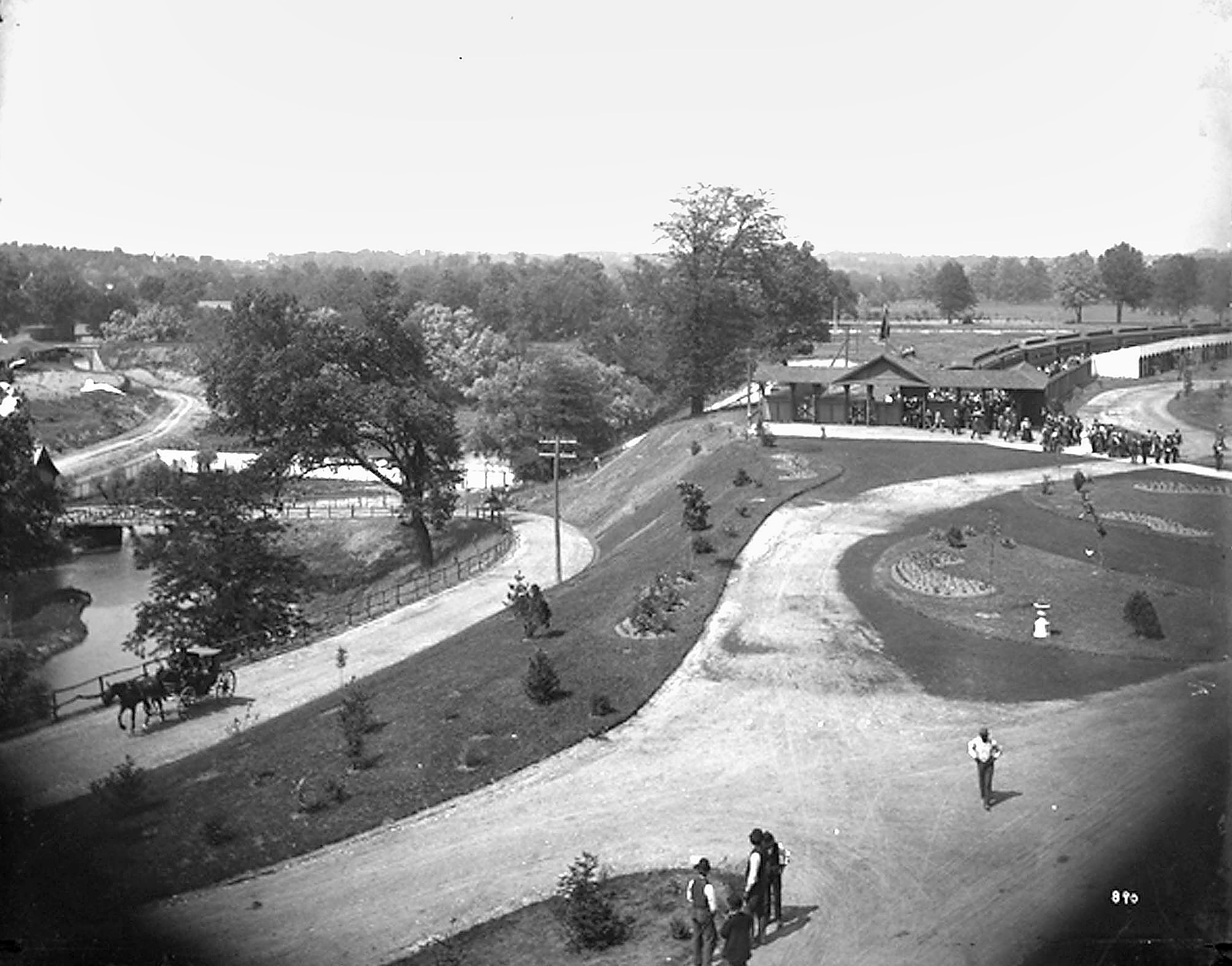 Historic photo of the Oakley Race Track with the B&O Midland Railroad in the background, looking north northeast from what would today be the end of 28th Avenue. Duck Creek is at the left center, and Duck Creek Road can be seen winding its way to the short tunnel under the B&O Railroad that remains today. The street with the bridge over the creek and the horse and buggy is an early Robertson Avenue, which has since been cut straight up the hill. I-71 now occupies most of the valley at the left, and the entrance to the race track with the railroad spur is now roughly the corner of Robertson and Millsbrae.