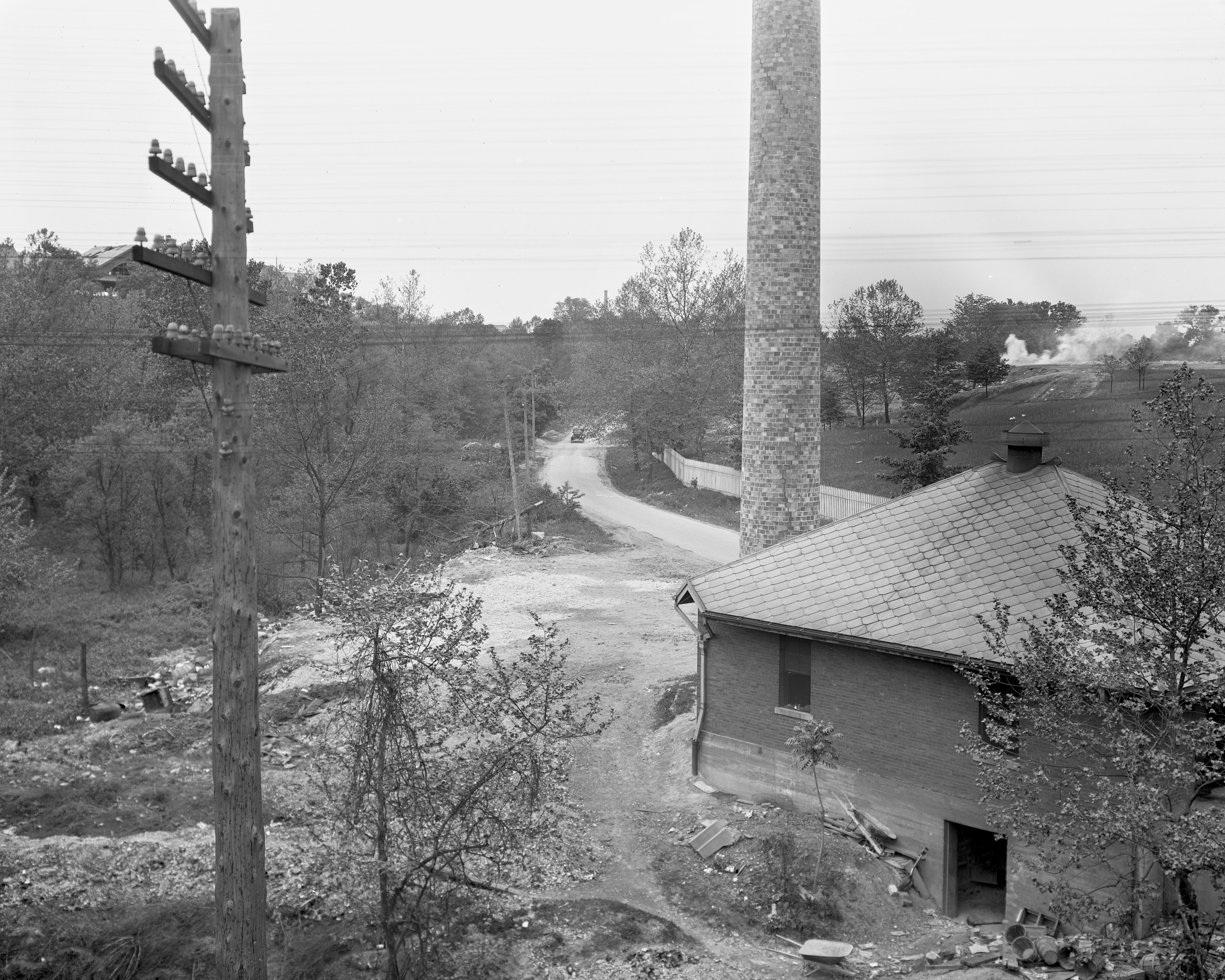 Historic photo of Duck Creek Road approaching the B&O Midland Railroad tunnel, looking south from atop the railroad embankment . Note the roof of the Oakley Racetrack at the left behind the trees. From the University of Cincinnati Library Digital Resource Commons, Street Construction and Improvements collection.