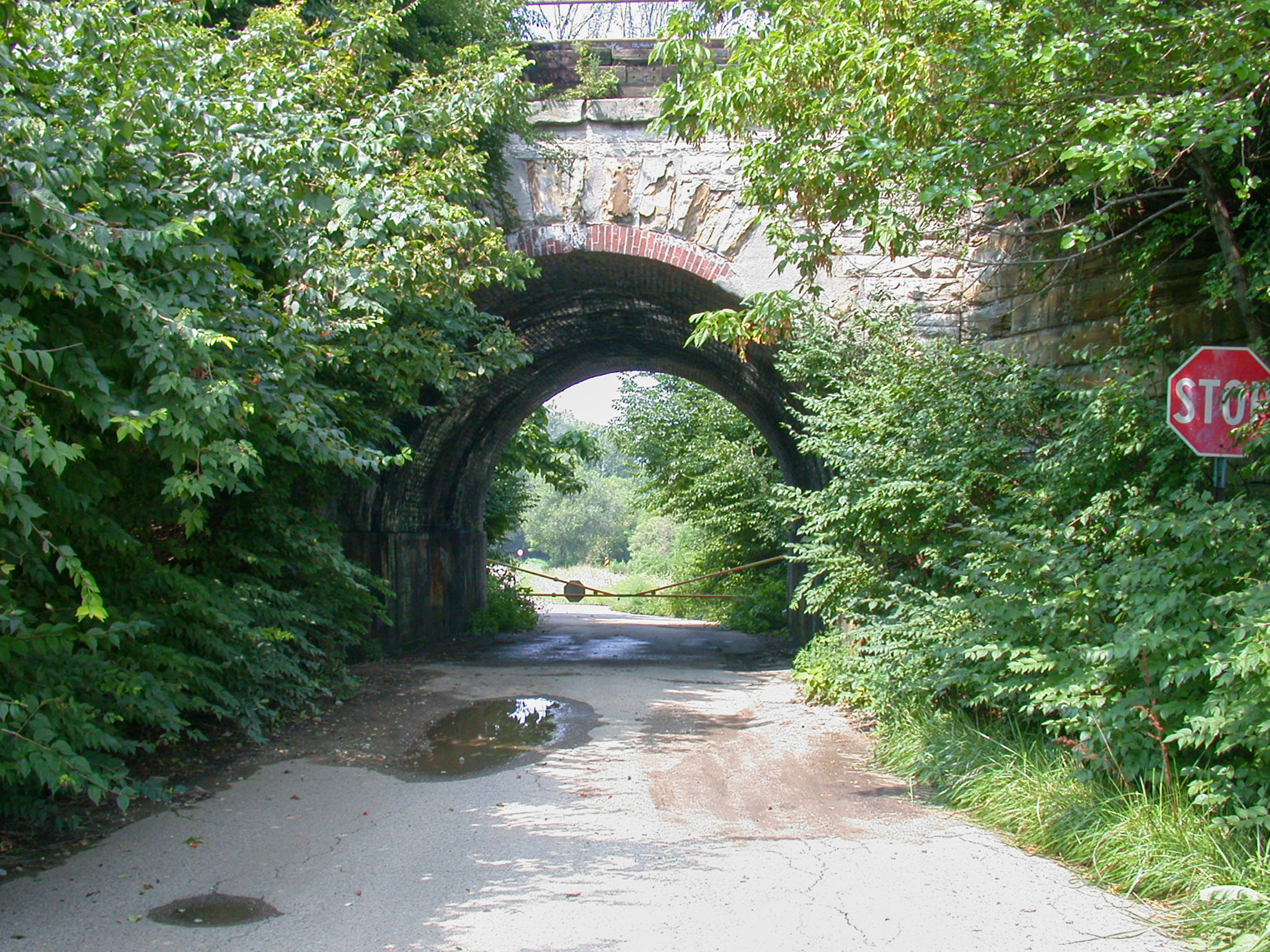 The B&O line crossing over Duck Creek Road in Norwood, looking north. As serene as this view looks, I-71 is just 100' off to the right. The US Playing Card Company is behind and to the left. Some maps mark this road as Harris Avenue, but it is basically a back entrance to the old US Playing Card Company factory. The exact date of the tunnel is unknown, but it's probably no newer than the 1880s. It could date to the original 1860/1861 construction of the line through here, but with no cornerstone it's anybody's guess about its exact age.