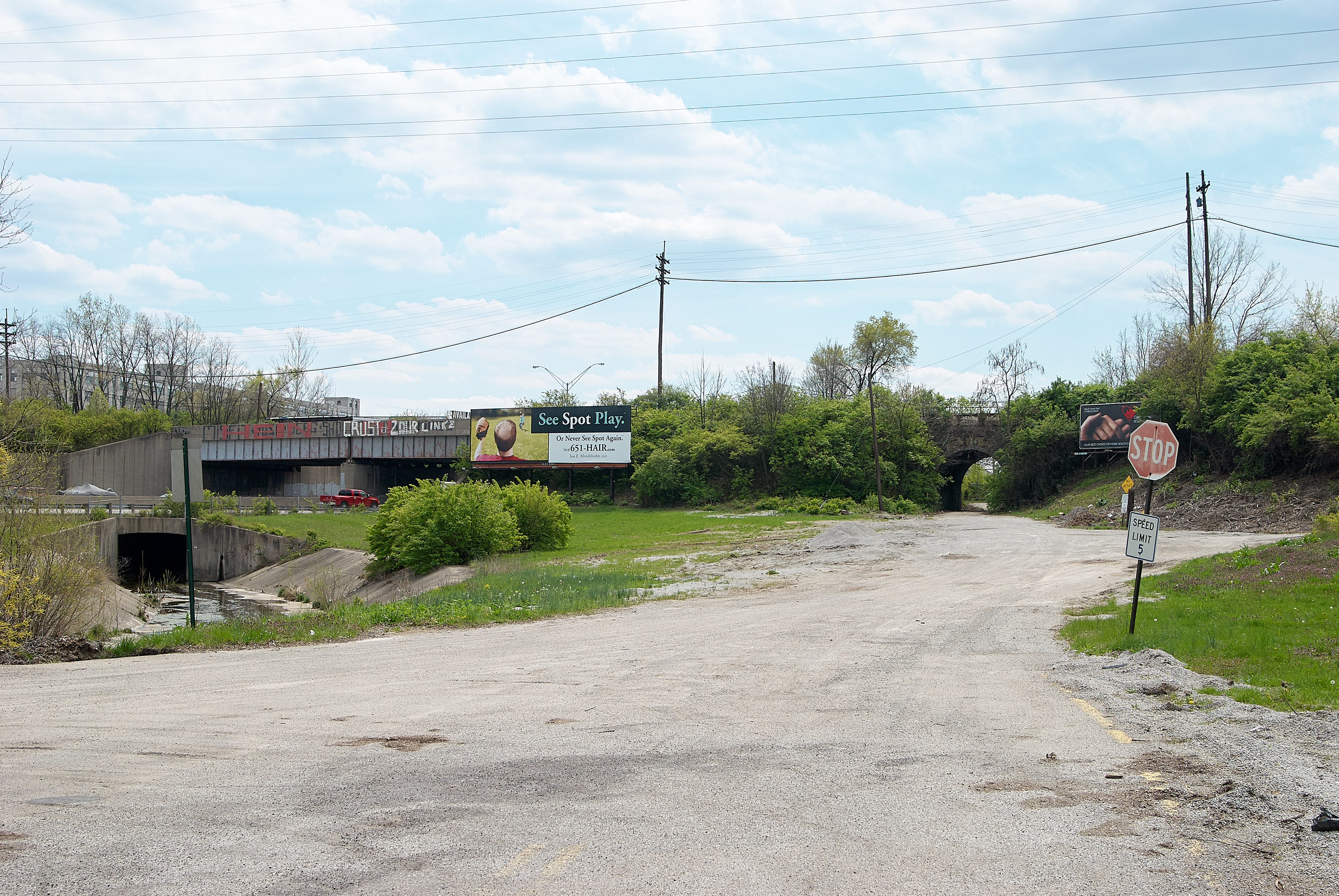 B&O line crossing Duck Creek Road and I-71 in Norwood, looking south. Although from this angle the old tunnel for Duck Creek Road is easy to see, from I-71 at the left it's usually hidden by the brush. Duck Creek itself gets a short breath of air at the left before diving under I-71 again farther to the left.