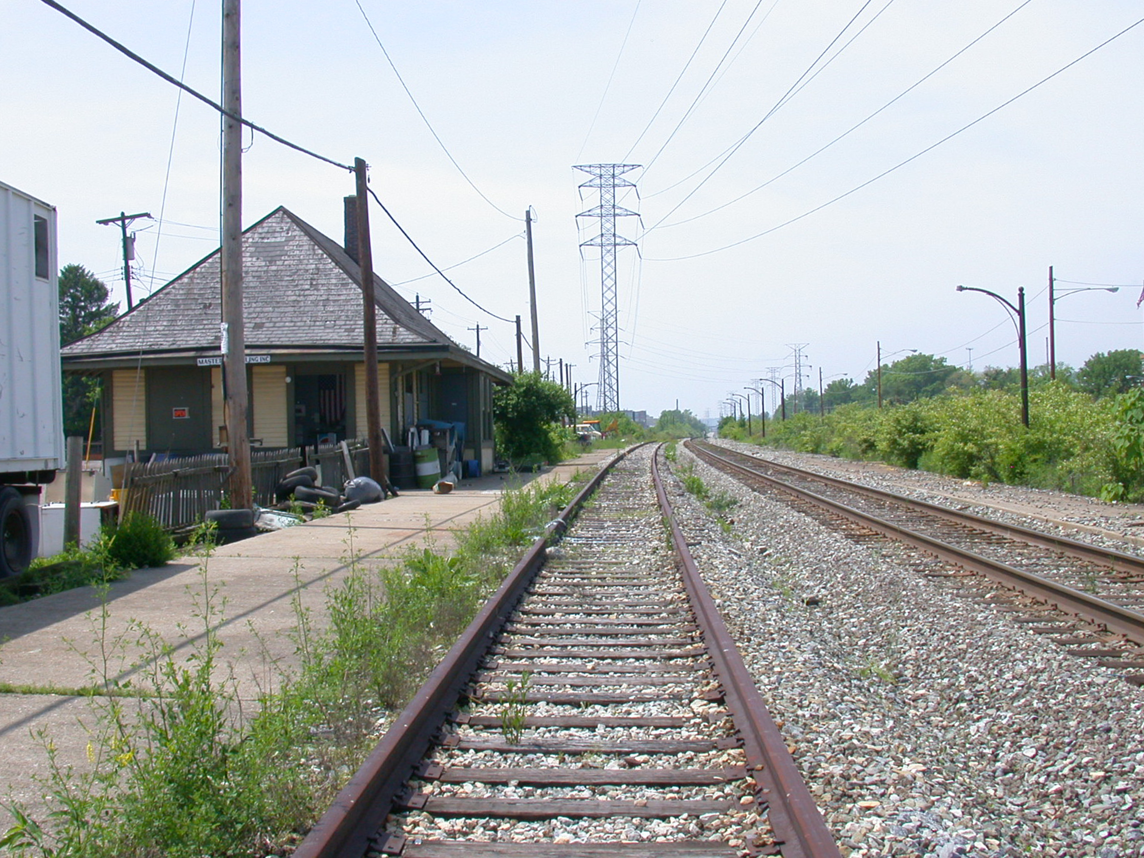 The old B&O Oakley station, looking west along the old platforms. Note how much higher the roadbed has gotten over the years. Also note the now disused light masts for the right platform.