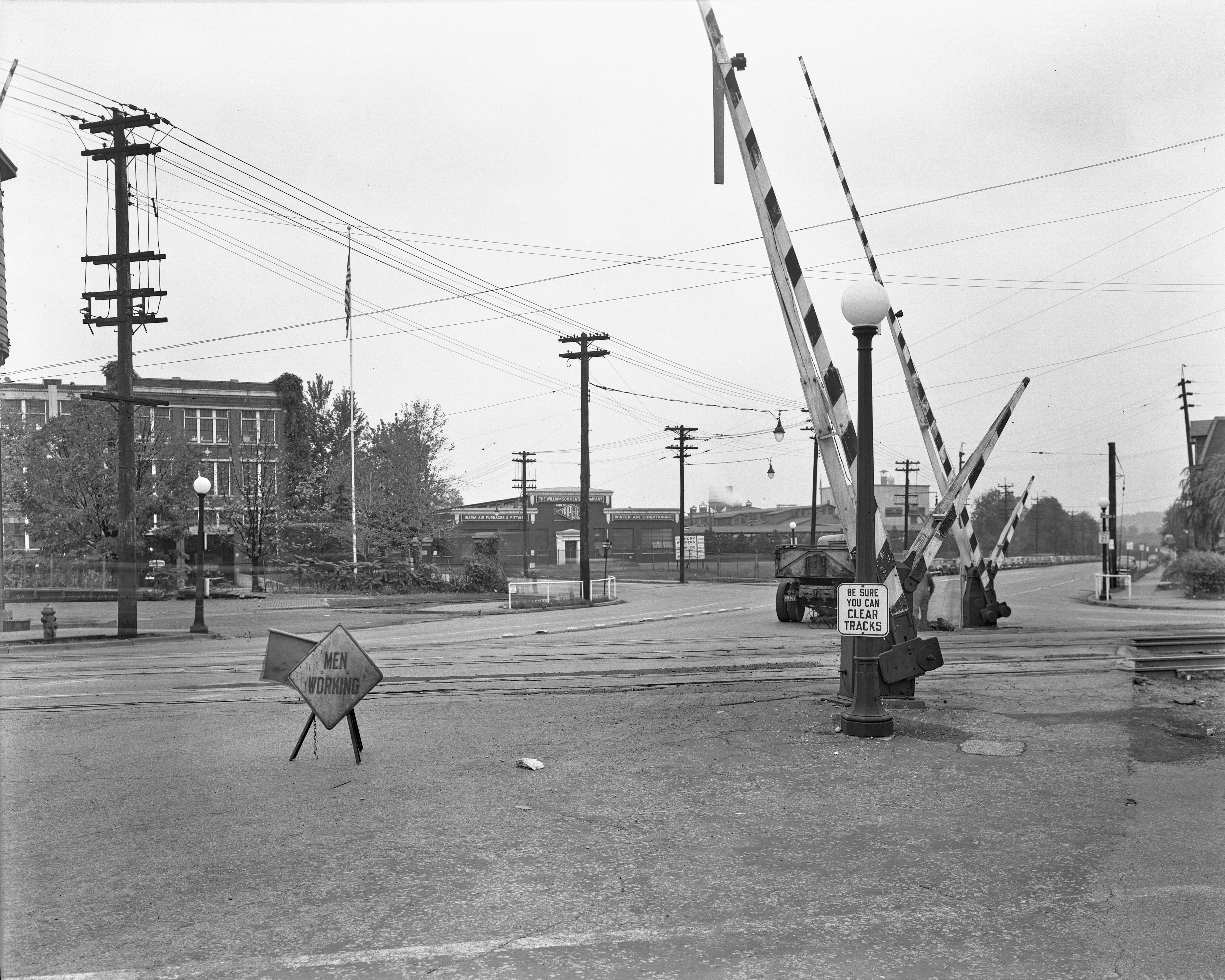 Historic photo of the B&O grade crossing at Madison Road and Marburg Avenue in Oakley, looking north northeast into the old Cincinnati Machine complex. The edge of the water tower seen a few pictures back is barely visible at the left. This crossing was grade-separated in 1959. From the University of Cincinnati Library Digital Resource Commons, Street Construction and Improvements collection.