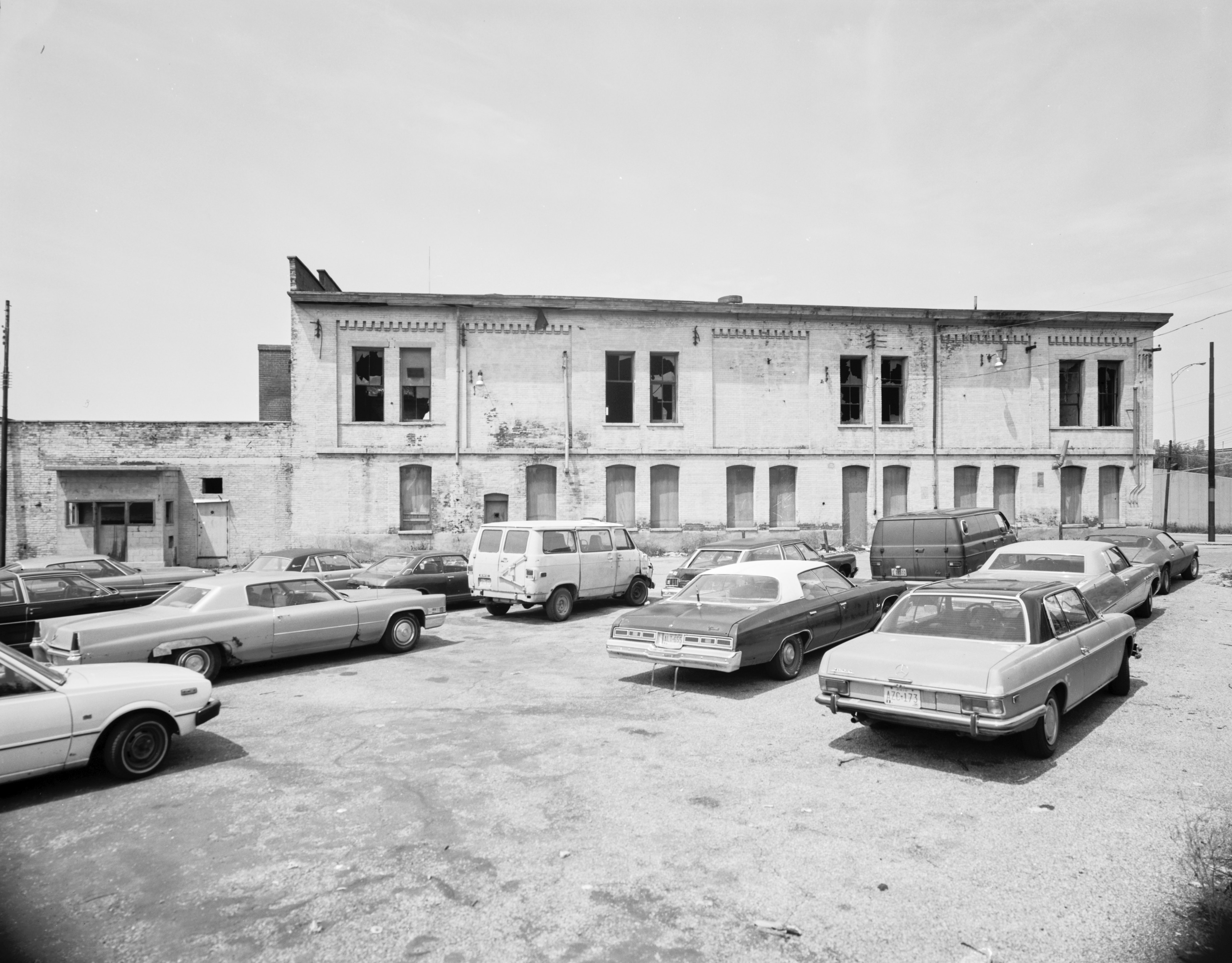 Historic photo of the Brighton carbarns on Harrison Avenue, taken in 1983 before the complex was demolished.