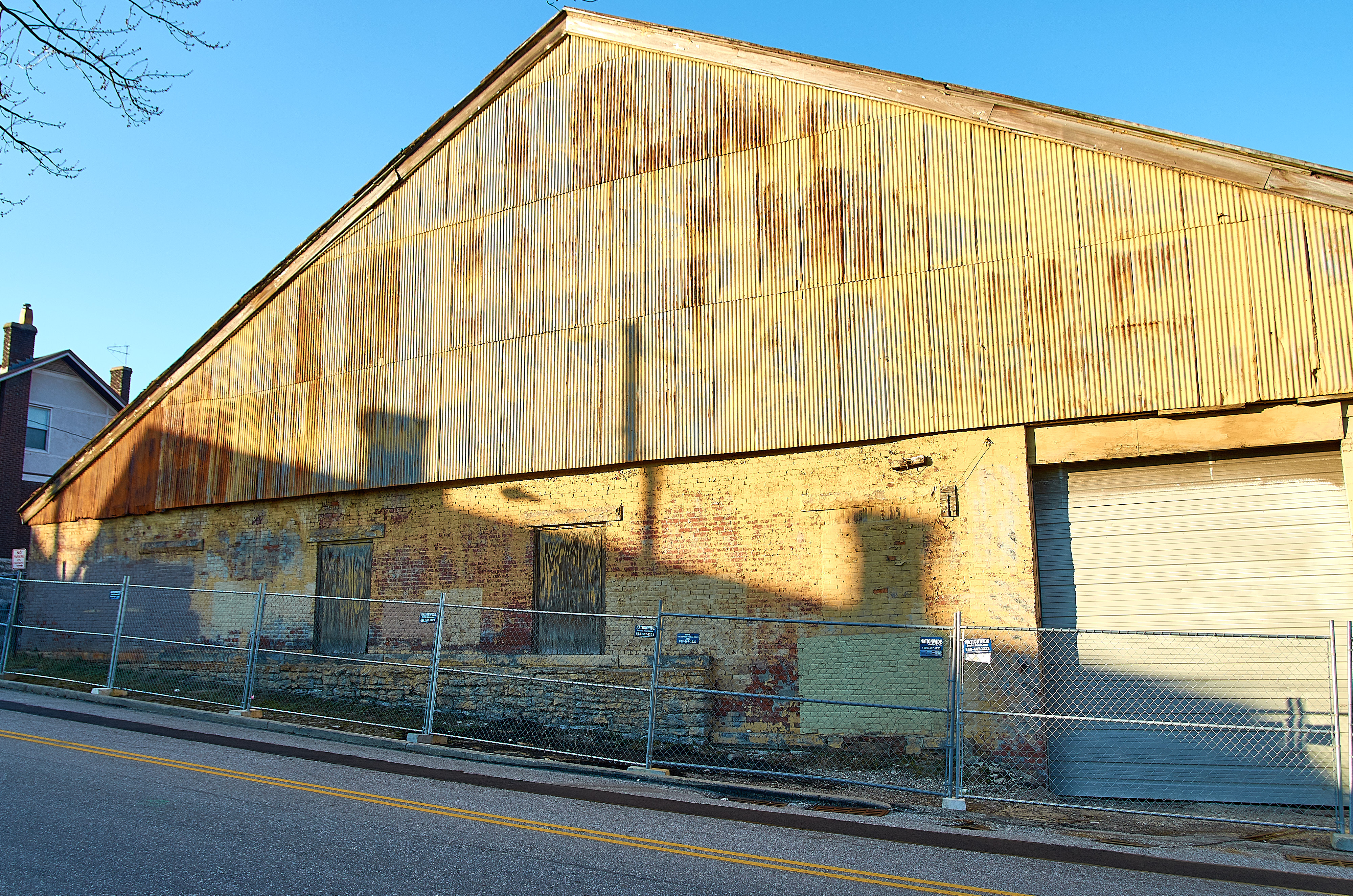 The Avondale division carbarn, looking northwest from across Kinsey Avenue. The building is fenced off for demolition.