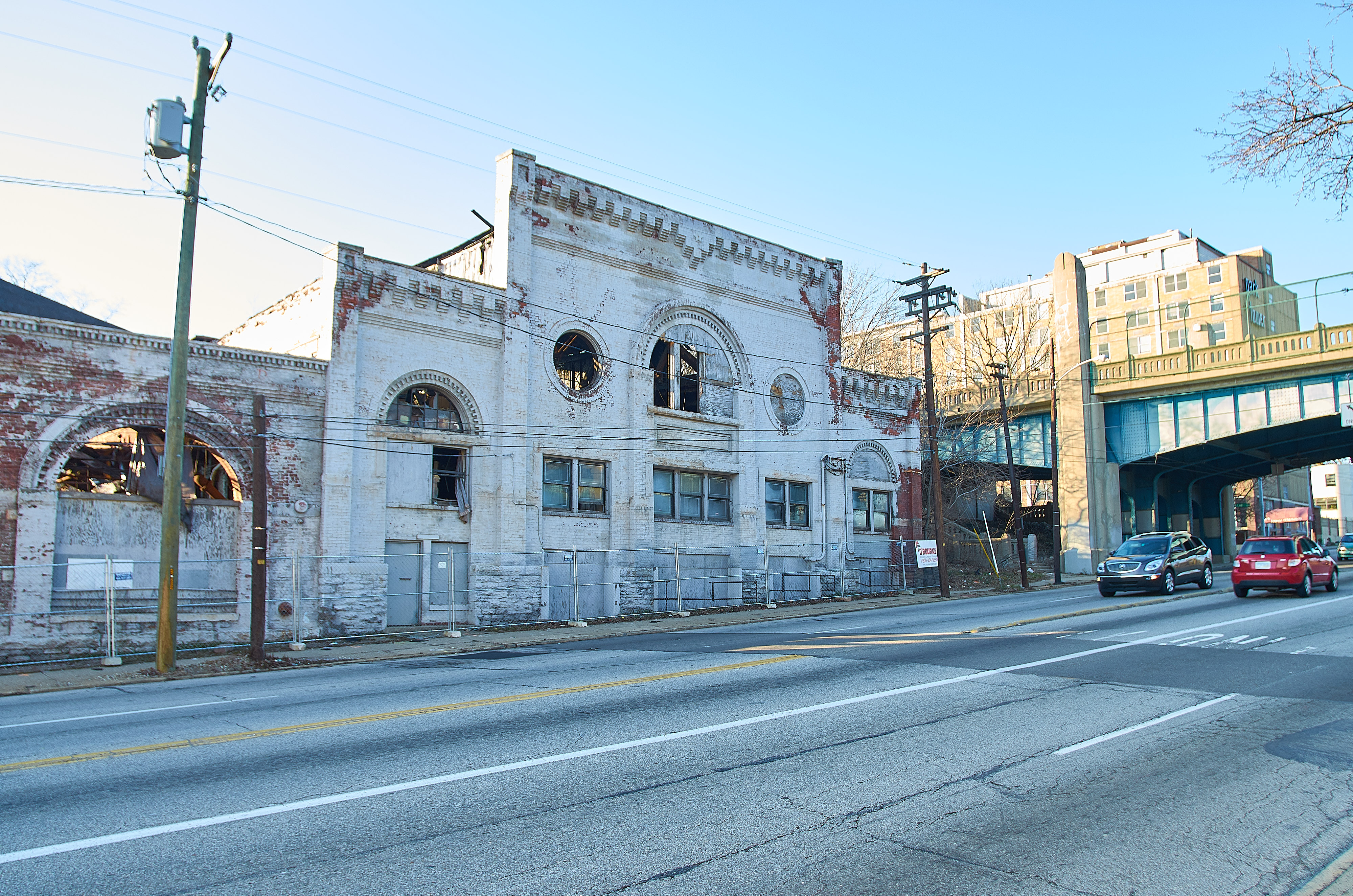 The Avondale division carbarn elevation along Reading Road, looking northwest. The McMillan Street overpass is at the right.