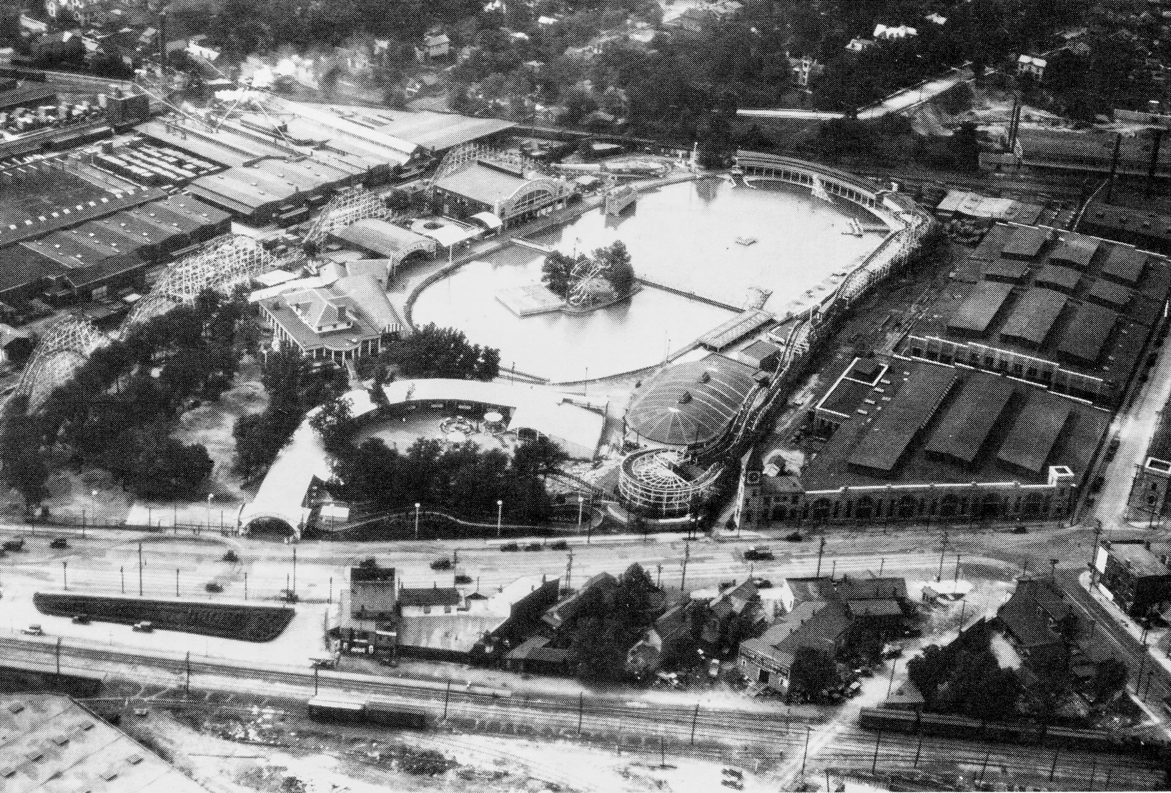 Historic aerial photo of Chester Park and the Cincinnati Car Company buildings in Winton Place, looking northeast across Spring Grove Avenue and the B&O Midland Railroad. Note the streetcar loops at the left side of Spring Grove Avenue. The B&O/CH&D Railroad is at the top, and Mitchell Avenue is at the bottom right.