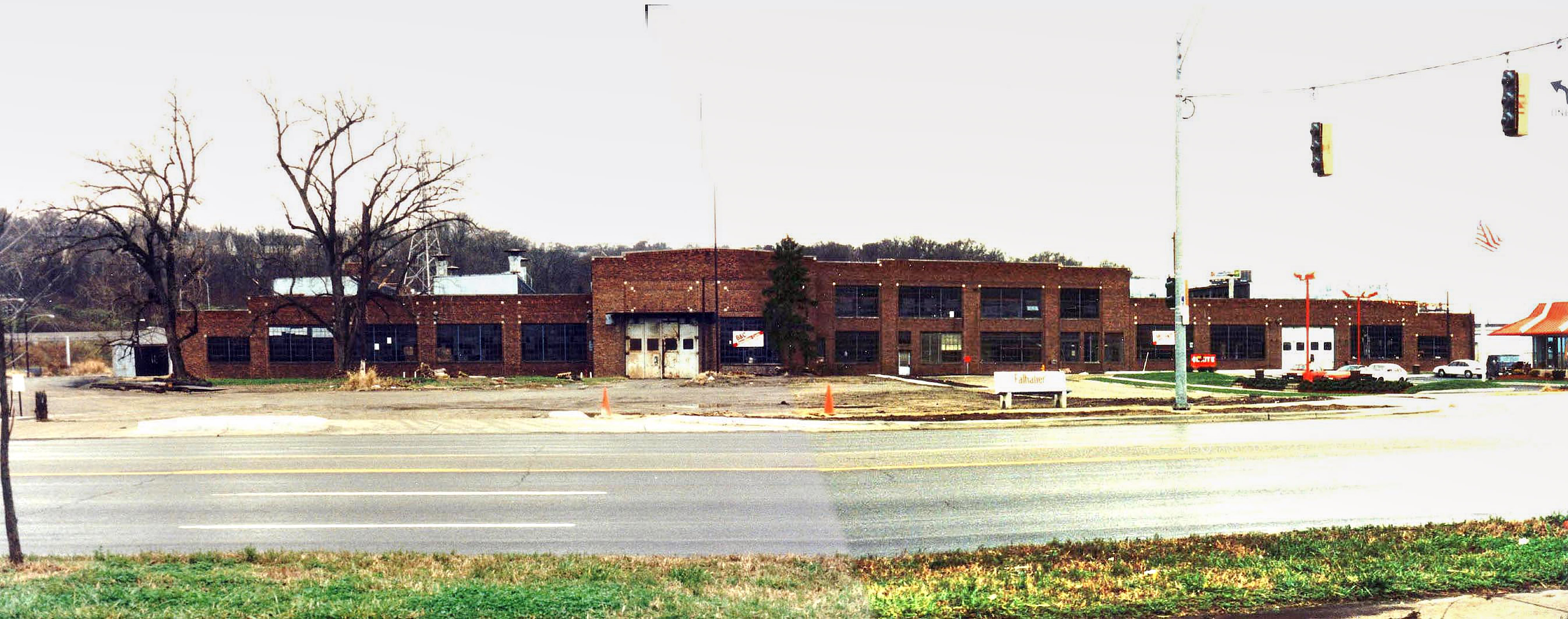 CSR Winton Shops along Mitchell Avenue shortly before demolition in late November 1992, looking southwest across Mitchell. The stoplight for Kenard Avenue is at the right, but the road has only just started construction. The McDonalds that remains today is at the far right. Photo by David Frey