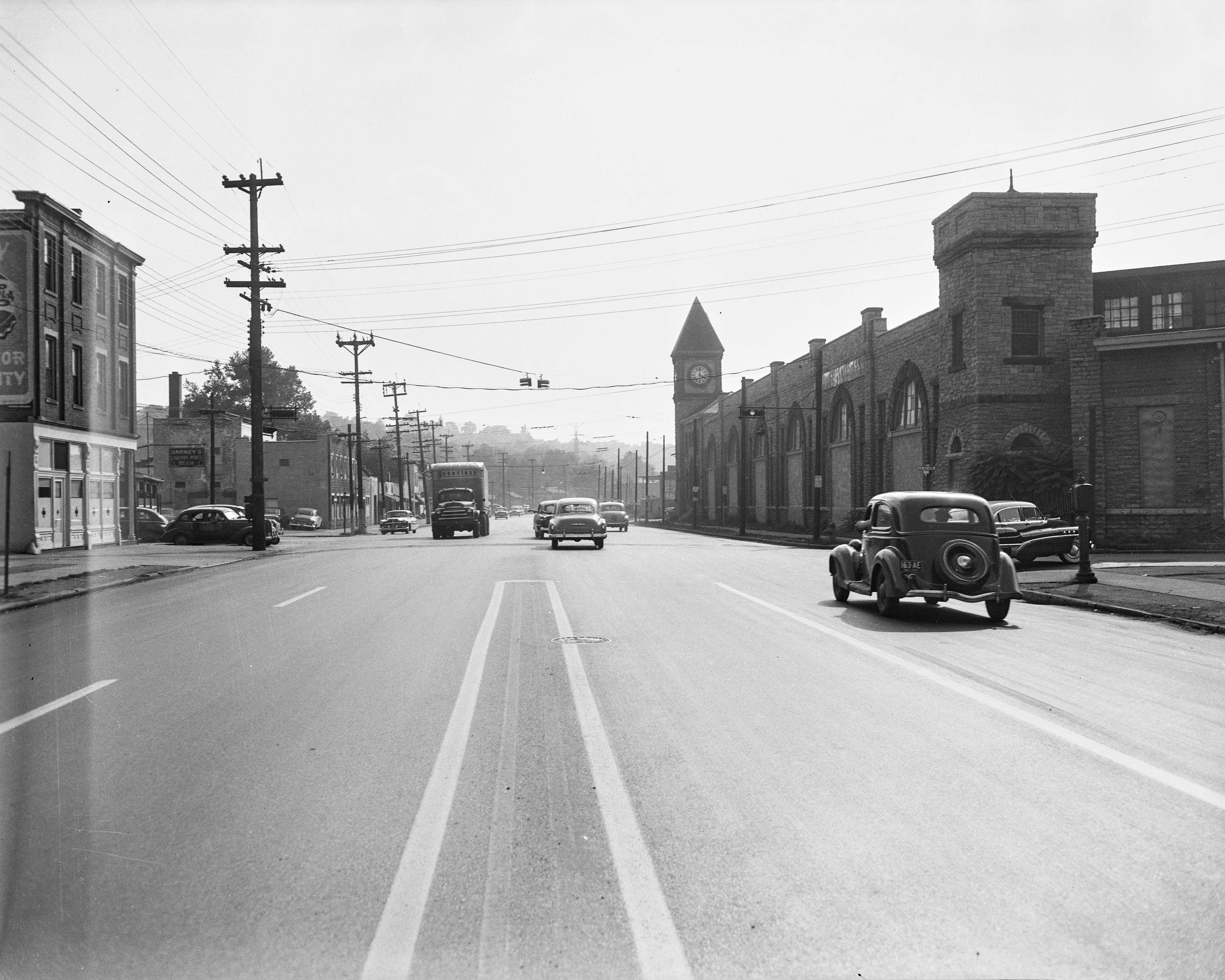 Historic photo of the Cincinnati Car Company shops at Spring Grove Avenue at Mitchell Avenue looking southwest sometime in 1951.