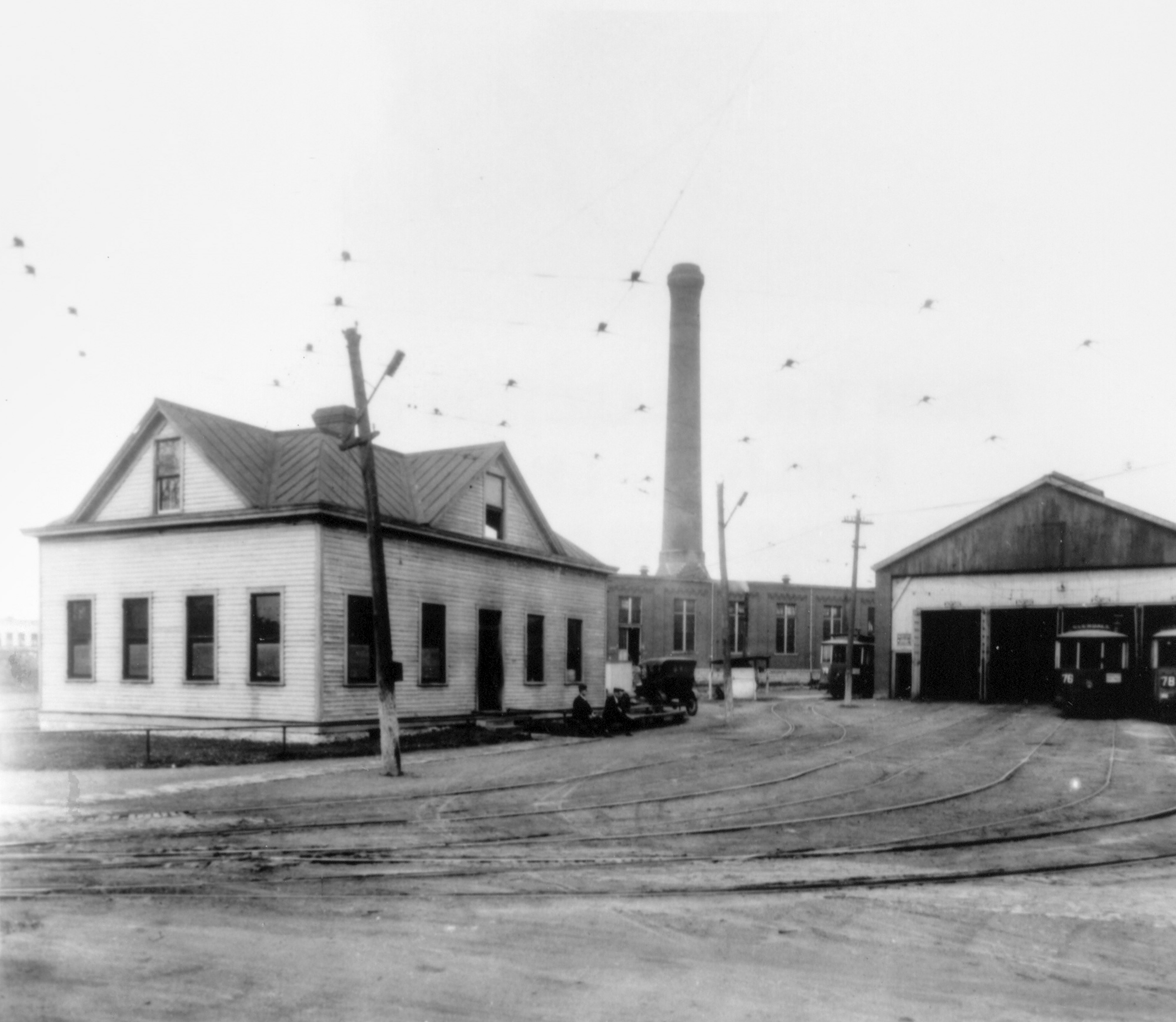 Historic photo of the Cincinnati & Hamilton Hartwell car house and clubroom on DeCamp Avenue, looking north. Since there are numbered streetcars in the barn, this shot was likely taken after absorption into the street railway company. The power house is in the background. Photo from Phil Lind