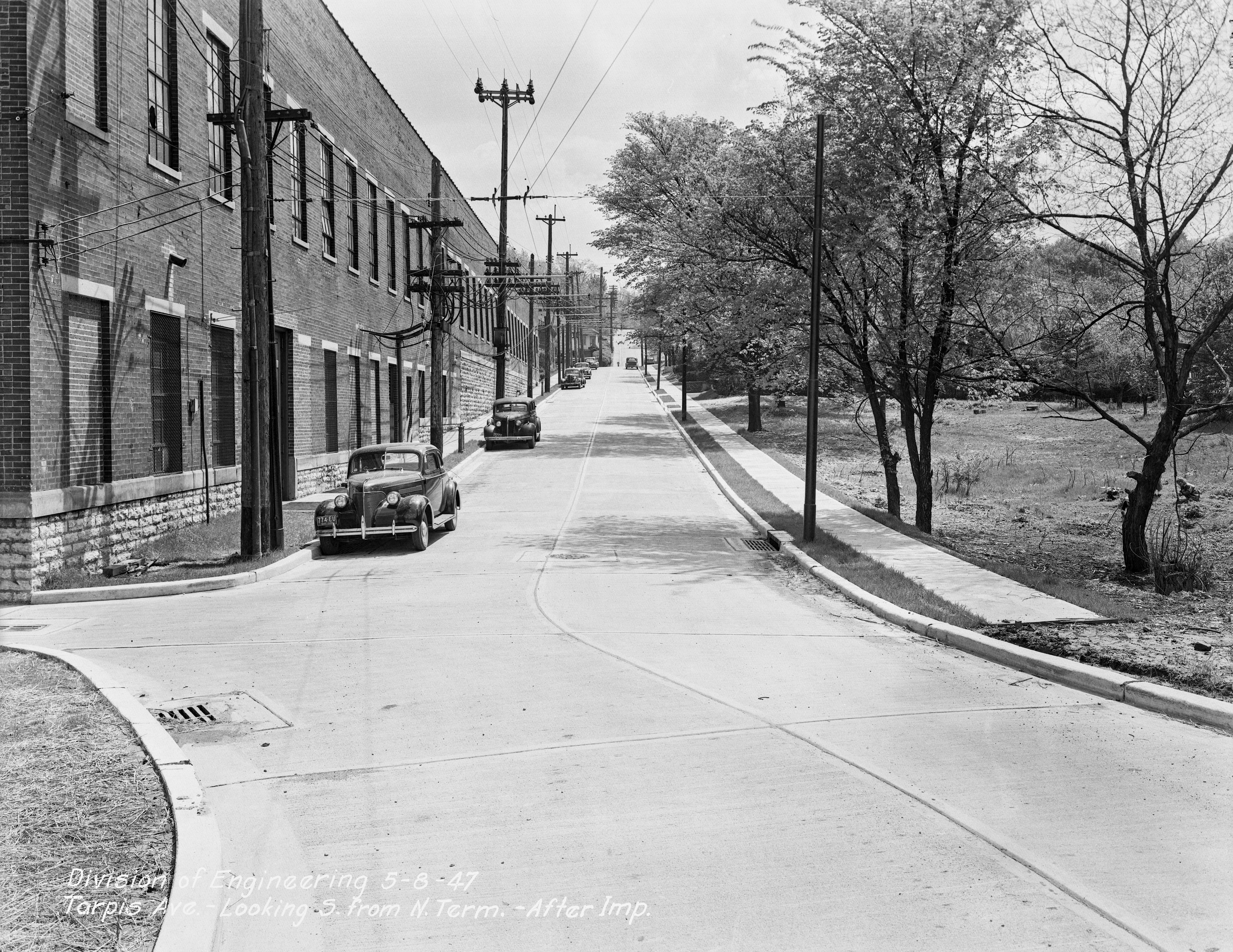 Historic photo of Tarpis Avenue and the Hyde Park Carbarns, looking south from near the end of the street. The little turnout with the drain in the middle of it at the extreme left remains to this day at the end of the street. From the University of Cincinnati Library Digital Resource Commons, Street Construction and Improvements collection.