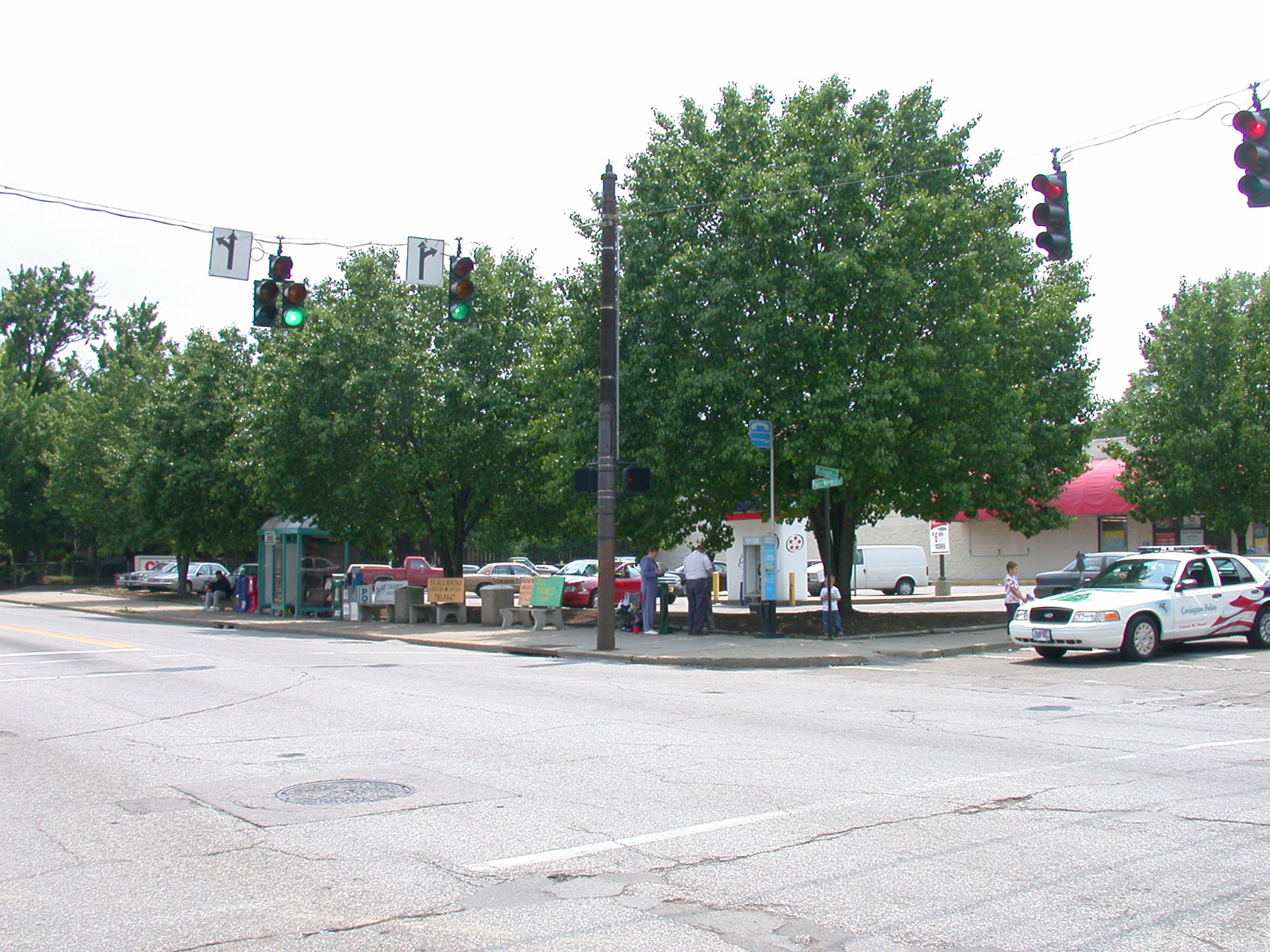 Location of carbarns and shops at the corner of 20th and Madison in Covington, Kentucky, looking southwest. The pole in the center is pictured in the Trolley Poles section, and the curved crack in the street on the left is pictured in the Revealed Tracks section.