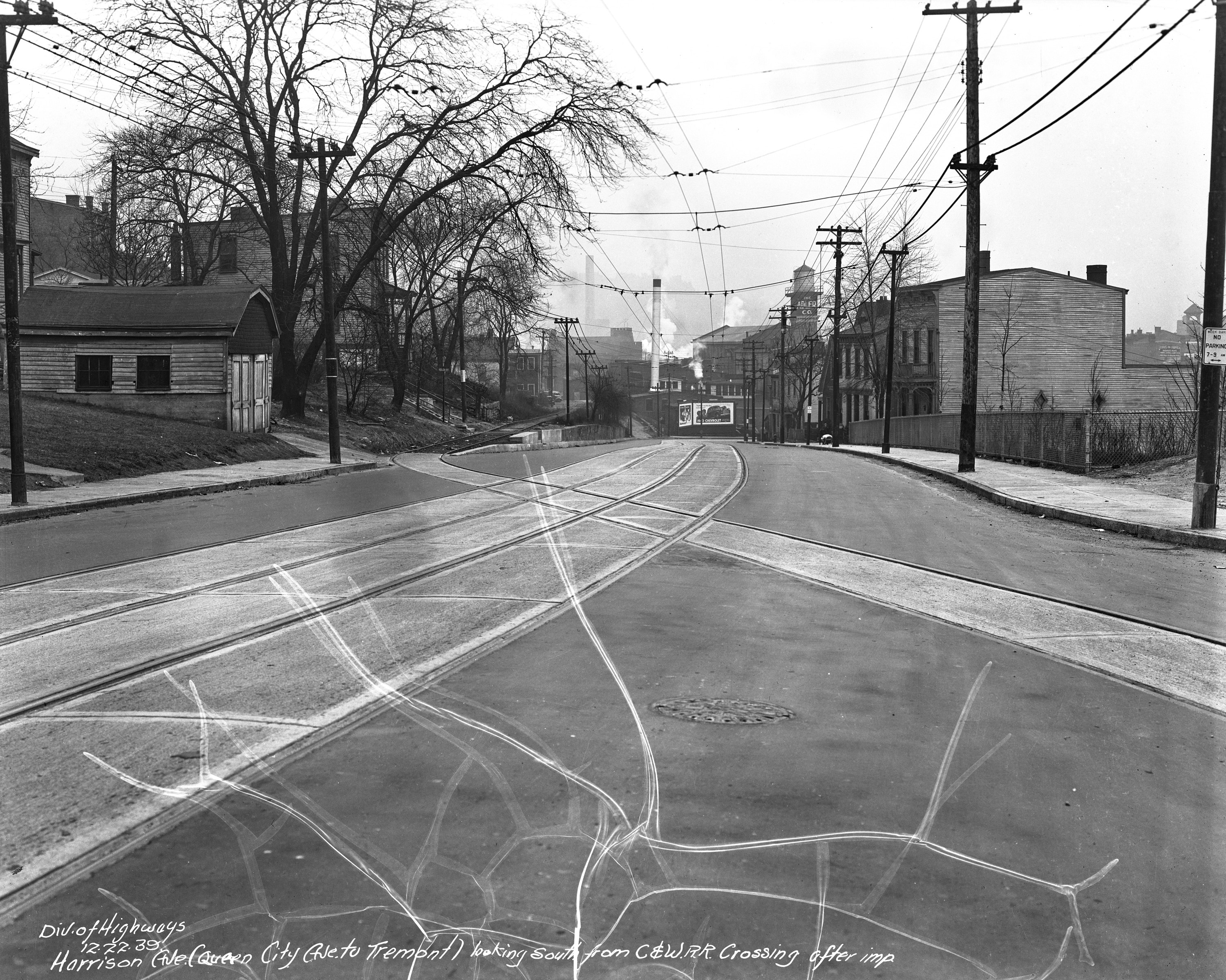 Historic photo of the Cincinnati & Westwood tracks crossing Harrison Avenue in South Fairmount after repaving, looking east. From the University of Cincinnati Library Digital Resource Commons, Street Construction and Improvements collection.