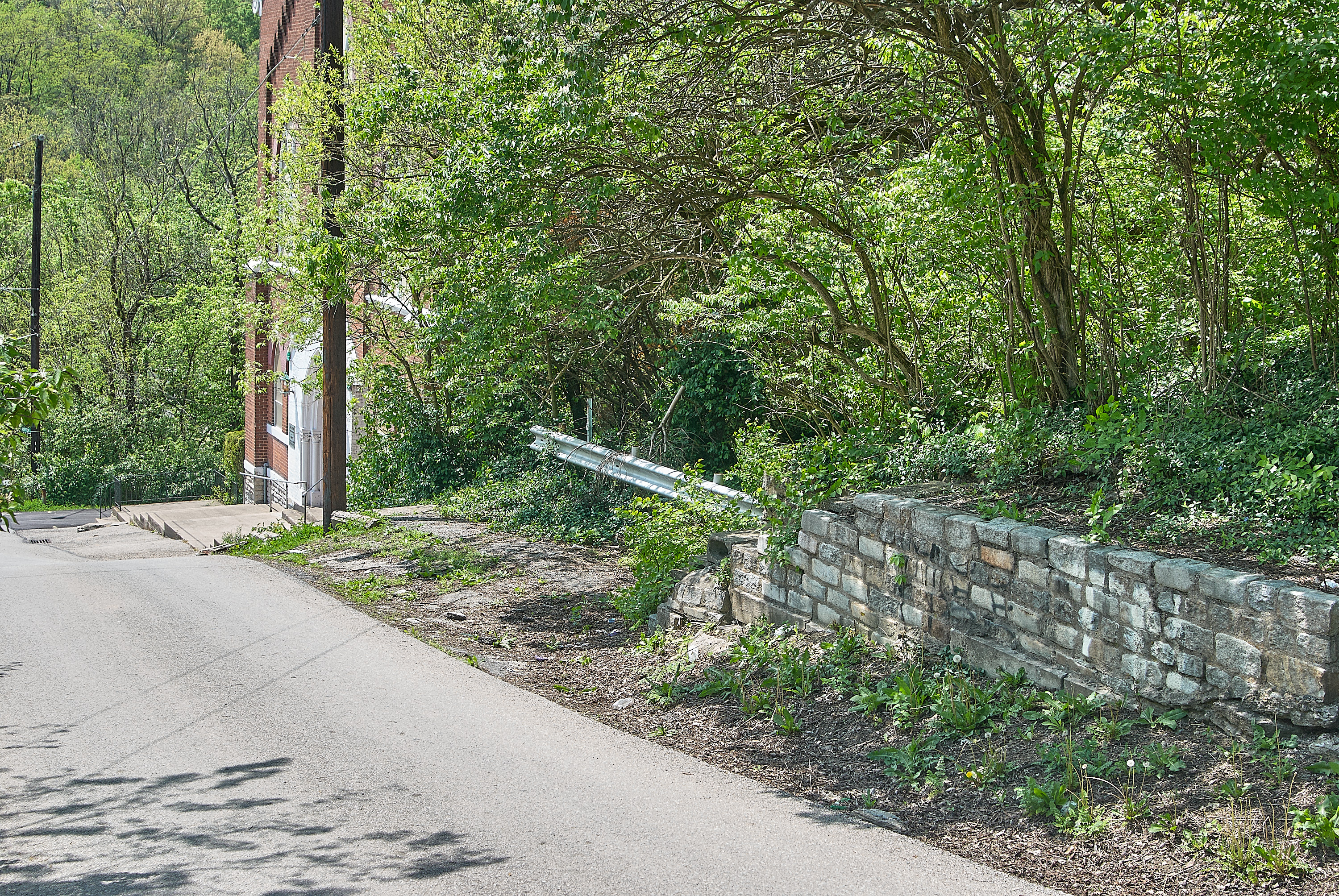 Cincinnati & Westwood right-of-way crossing Saffin Avenue in South Faimount, looking south along Saffin towards Horton Street. The railroad crossed the street here and proceeded into the woods behind the guardrail. The building in the background is Martini United Church of Christ. This is only a few blocks west of White Street, but there was a trestle crossing a valley just to the left of this photo (which is now paved over for the Church's parking lot), so there isn't anything more to see.