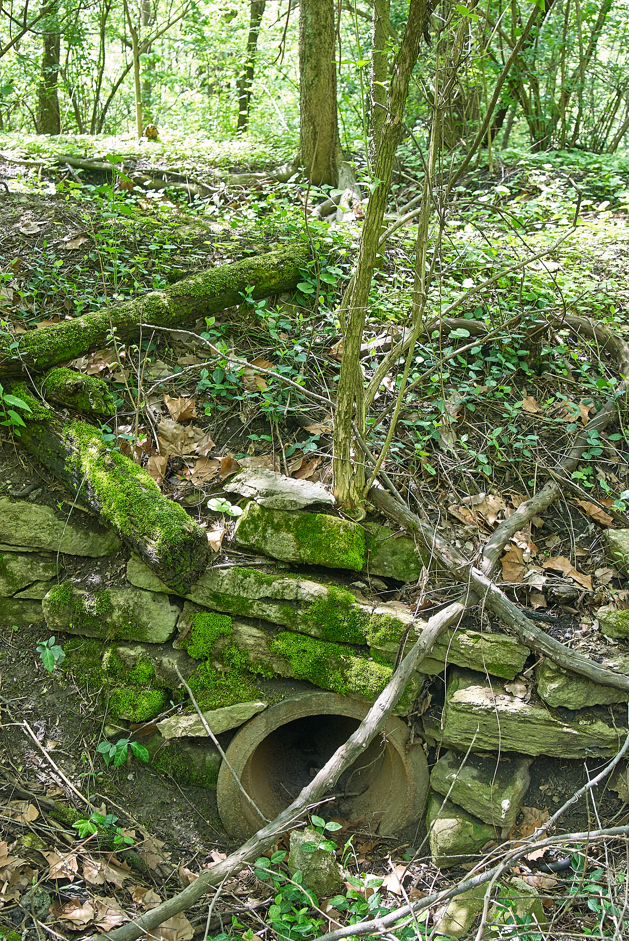 A small culvert on the Cincinnati & Westwood right-of-way in South Fairmount, looking south towards the roadbed. This simple little culvert is similar to ones seen along the Cincinnati & Columbus in Redbird Hollow.