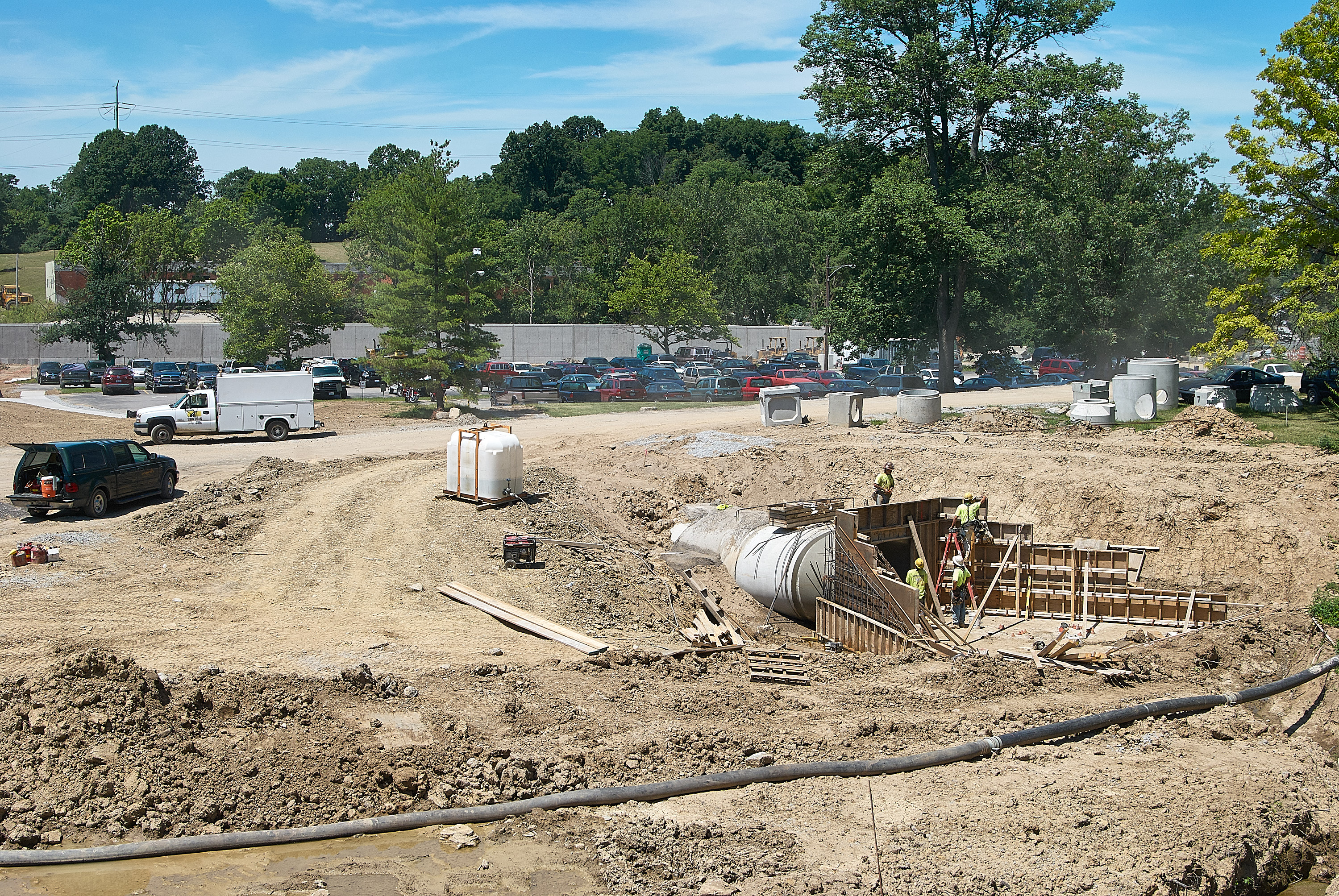Duck Creek flood control construction at the corner of Duck Creek Road and Oaklawn Drive, looking west. The C&C used to run from right to left across approximately the center of the photo. The construction workers are building a new inlet for a tributary creek that the C&C once bridged. That creek used to swing farther to the left, but it was rerouted sometime in the 1960's when Oaklawn Avenue was built and much of this area regraded. Duck Creek itself is behind the new concrete flood wall in the distance.