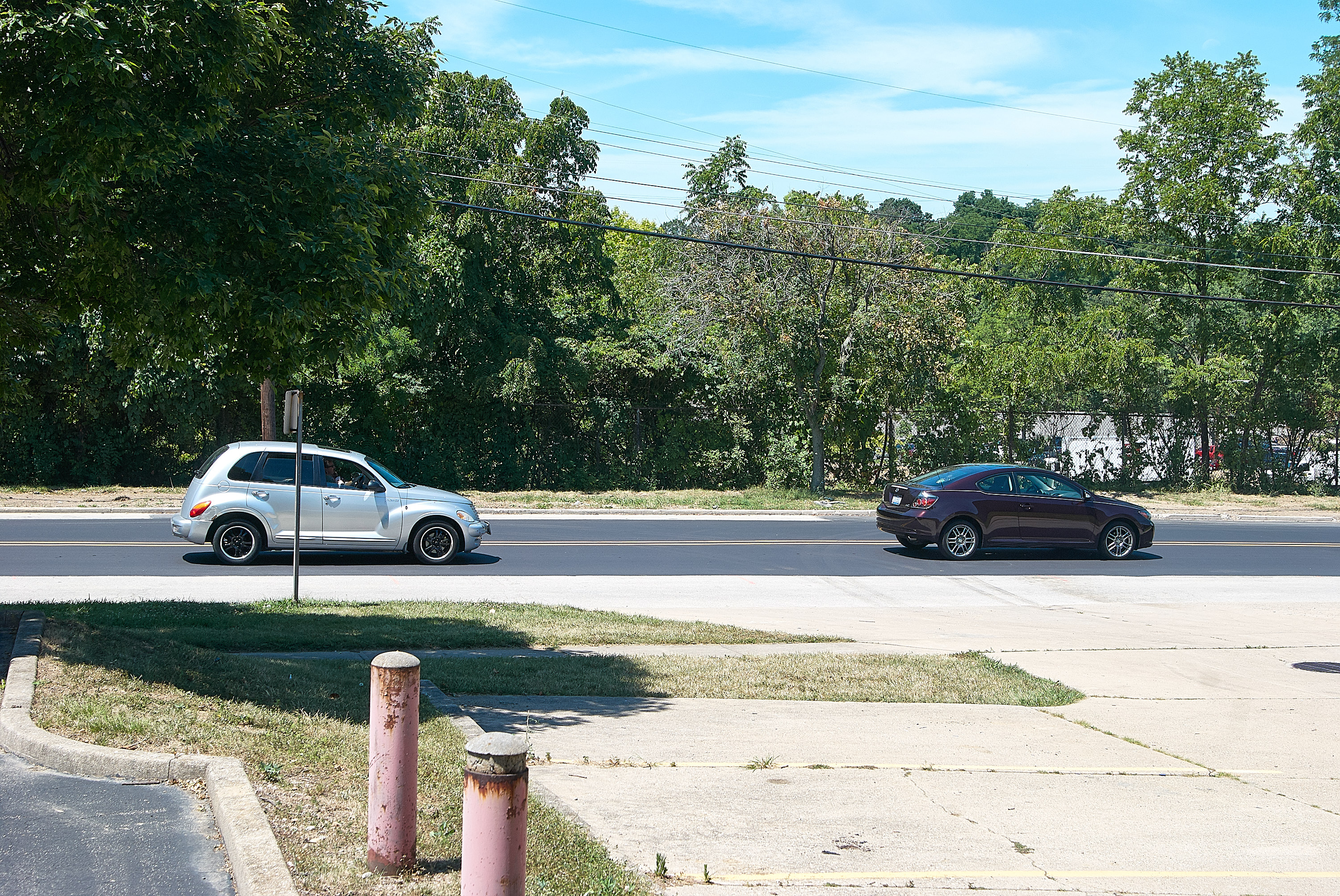 Location of the C&C where Oaklawn Drive now crosses, looking west. Note how much lower the tractor trailers and other vehicles are behind the fence past the road. The C&C roadbed was thus much lower than the road is now. This whole area east of Oaklawn being filled in to raise it above flood waters from Duck Creek.