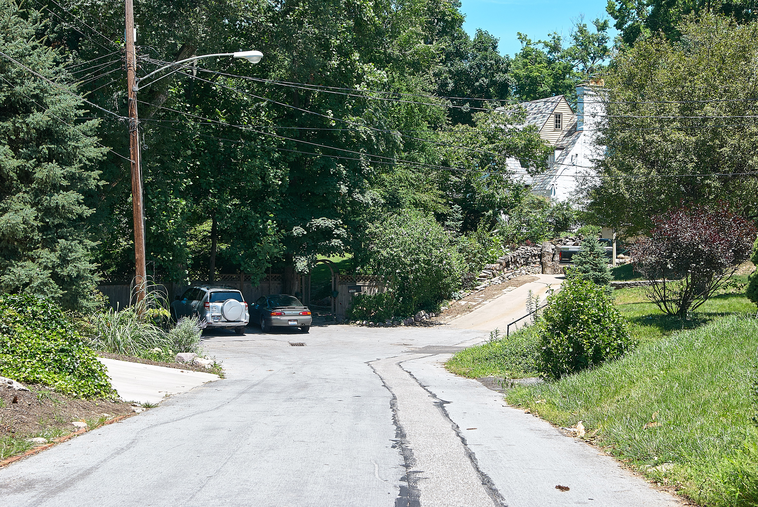 C&C ROW at the end of Collinwood Place, looking north. The house and shed from the last photo are behind the wood fence where the cars are parked. The C&C ran along the far edge of the turnaround at the bottom, but grading for the newer houses and their yards has erased any remains of the ROW.