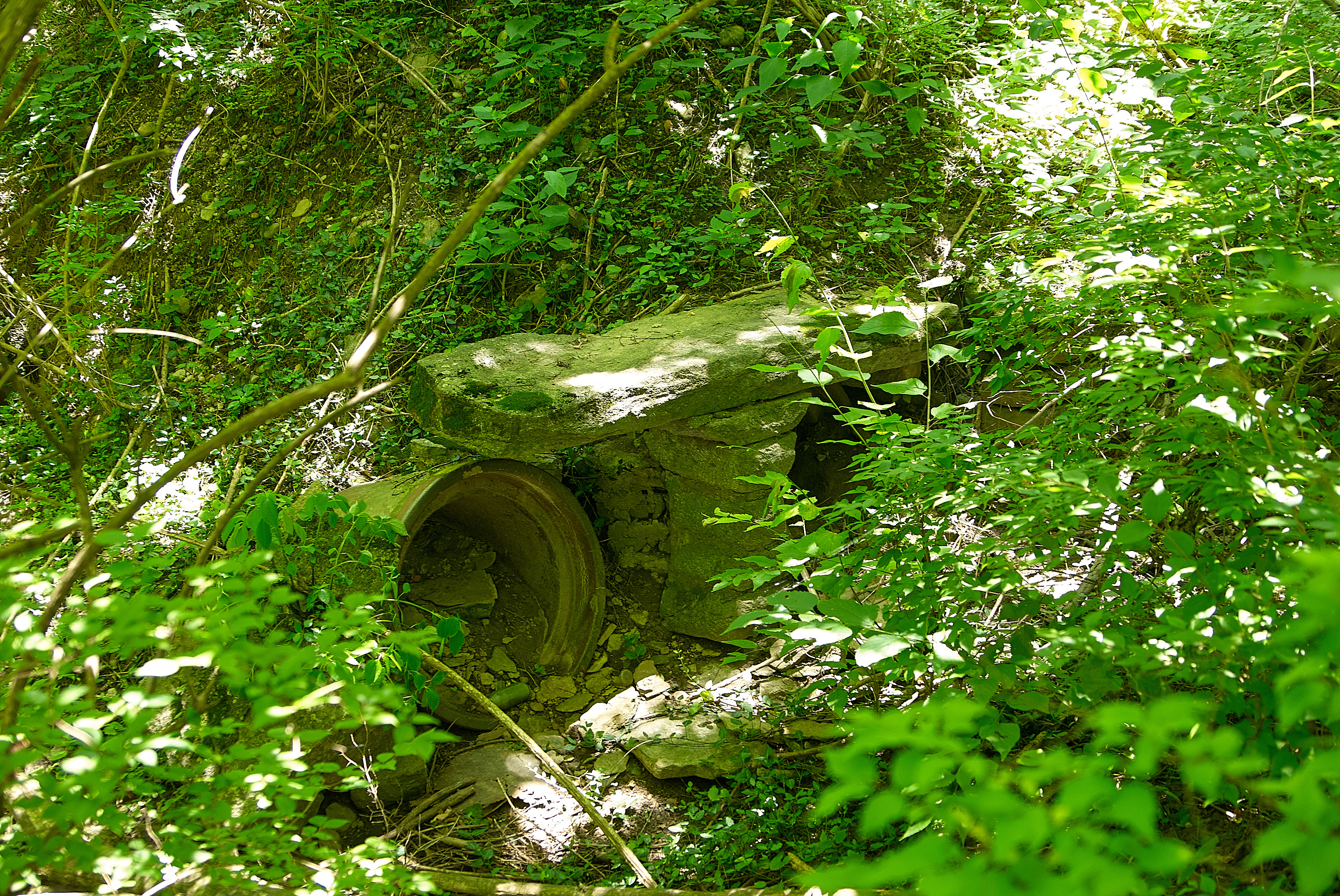 Remains of a washed away C&C culvert north of Camargo Road. This is the west inlet, and the roadbed itself is to the left. The pipes probably got blocked at some point, and the water eventually washed away the roadbed to get through.