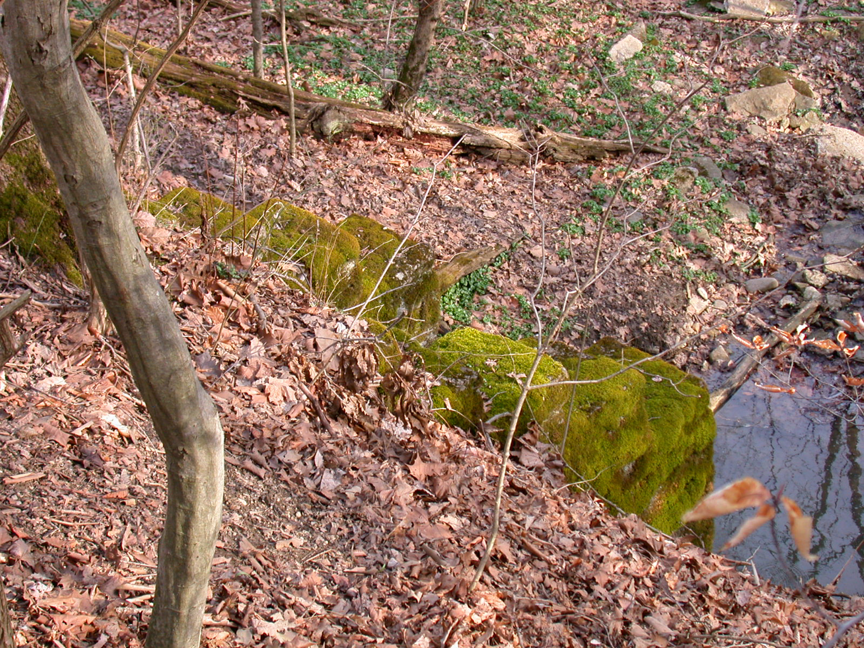 C&C culvert inlet, looking northwest through Redbird Hollow in southern Indian Hill. This is the inlet for the small arched culvert in the previous picture. The stones on the inlets, which are on the north side of the ROW, are usually covered much more thickly with moss than the outlets on the southern side of the ROW.