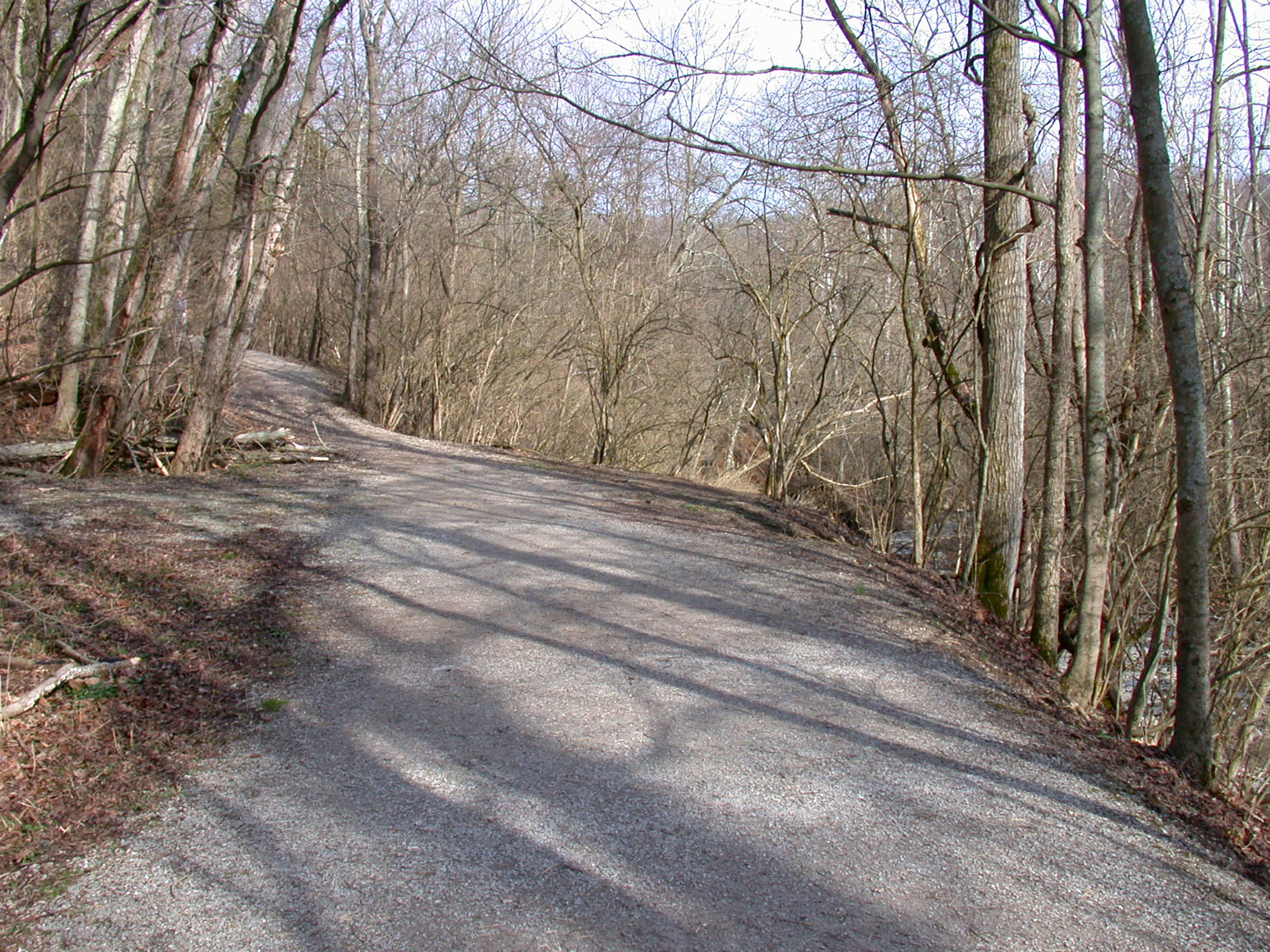 C&C ROW, looking east through Redbird Hollow in southern Indian Hill. The trail goes up the hill, but the ROW continued straight. The river has washed away the ROW beyond the center of this photograph.