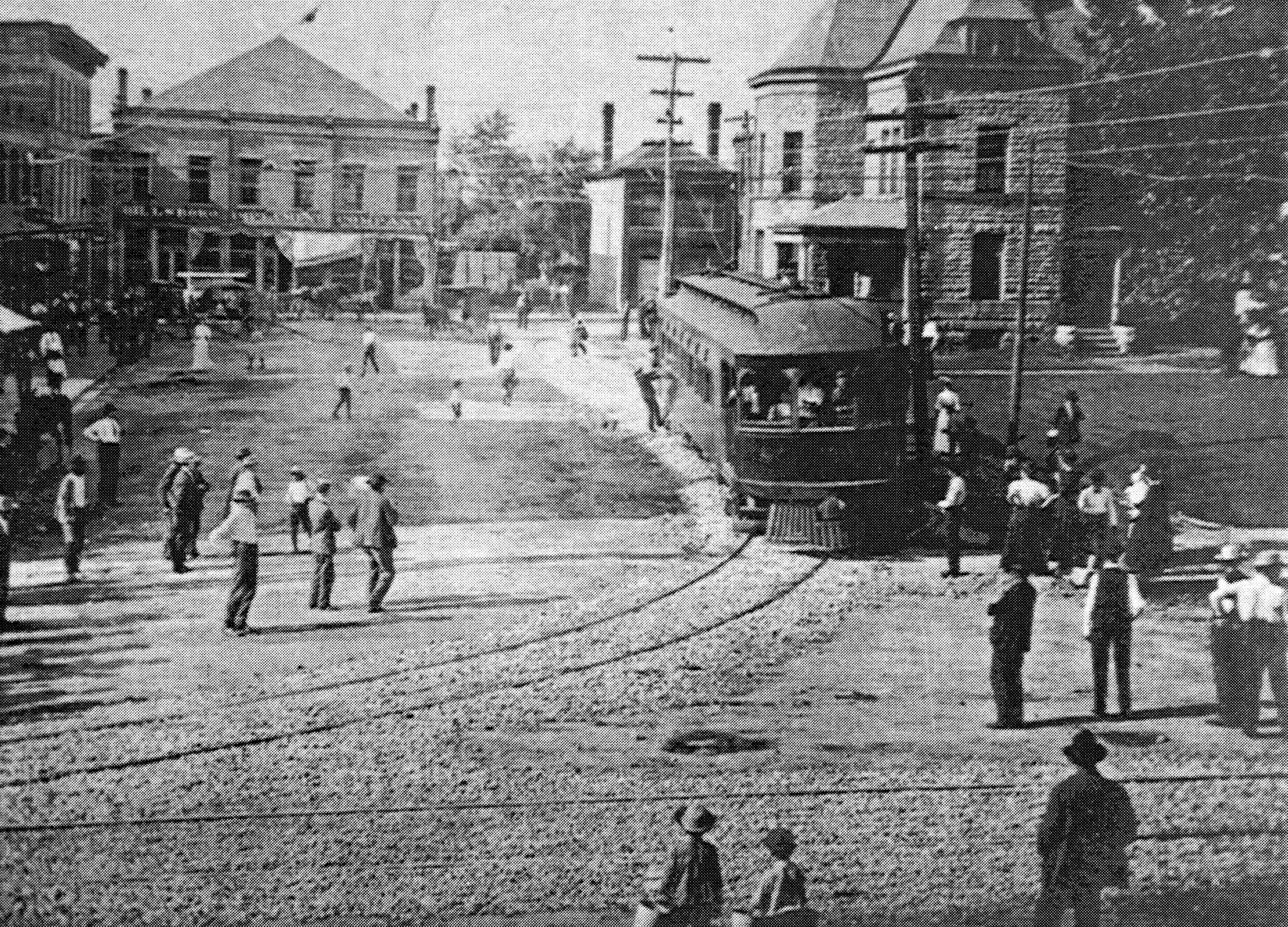 Historic photo of the first C&C car around the courthouse in Hillsboro, looking north across Main Street up Foraker Place on July 27, 1907. From "Cincinnati and Columbus Traction Co." by David McNeil, original photo by Frank Pence, from the Walter Simpson collection.