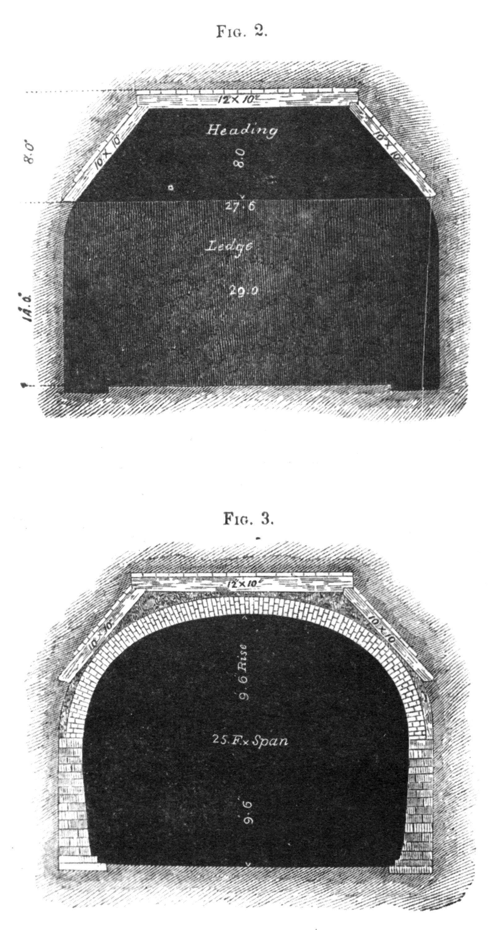 Cross sections of the Deer Creek Tunnel from the Dayton & Cincinnati Railroad's second annual report in 1854. The top section shows the rough cut and temporary wood arching while the bottom section shows the finished profile with stone walls and brick arching. From "Narrow Gauge in Ohio" by John W. Hauck